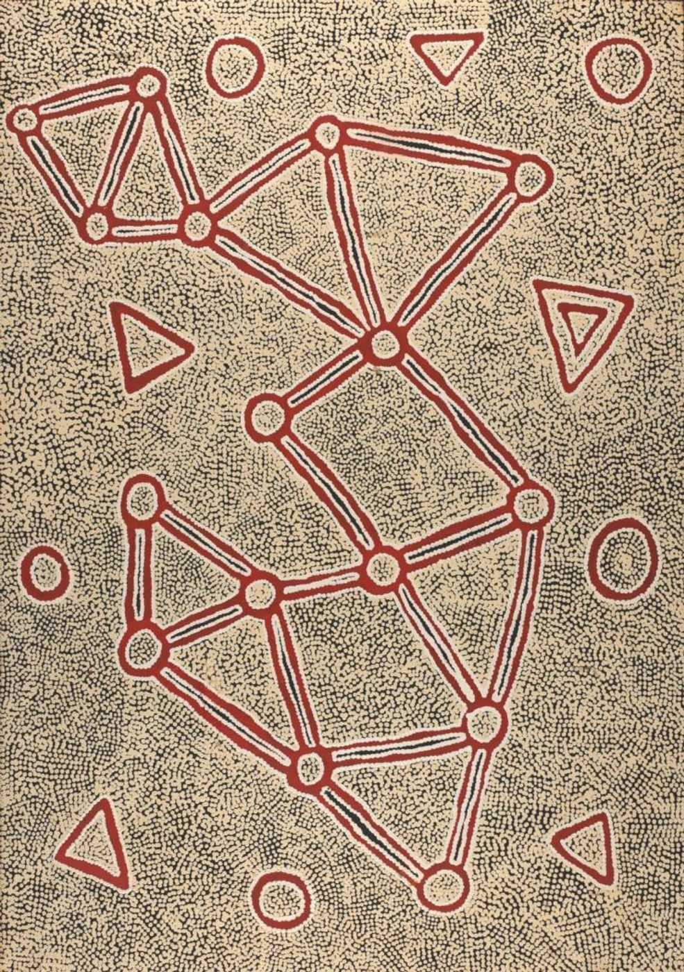 In contemporary Warlpiri paintings, traditional iconography is used to represent the ‘Jukurrpa’ (Dreaming), associated sites, and other elements. Short dashes are often used to represent ‘mangkurdu’ (cumulus & stratocumulus clouds), and longer, flowing lines represent ‘ngawarra’ (flood waters). Small circles are used to depict ‘mulju’ (soakages) and river beds.