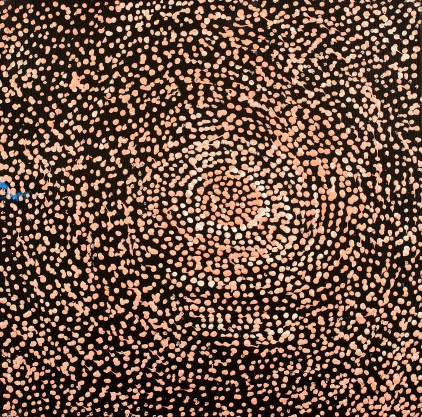 The site depicted in this painting is Puyurru, west of Yuendumu. In the usually dry creek beds are ‘mulju’ (soakages), or naturally occurring wells. The ‘kirda’ (owners) for this site are Nangala/Nampijinpa women and Jangala/Jampijinpa men. Two Jangala men, rainmakers, sang the rain, unleashing a giant storm. The storm travelled across the country from the east to the west, initially travelling with a ‘pamapardu Jukurrpa’ (termite Dreaming) from Warntungurru to Warlura, a waterhole 8 miles east of Yuendumu. At Warlura, a gecko called Yumariyumari blew the storm on to Lapurrukurra and Wilpiri. Bolts of lightning shot out at Wirnpa (also called Mardinymardinypa) and at Kanaralji. At this point the Dreaming track also includes the ‘kurdukurdu mangkurdu Jukurrpa’ (children of the clouds Dreaming). The water Dreaming built hills at Ngamangama using baby clouds and also stuck long pointy clouds into the ground at Jukajuka, where they can still be seen today as rock formations.