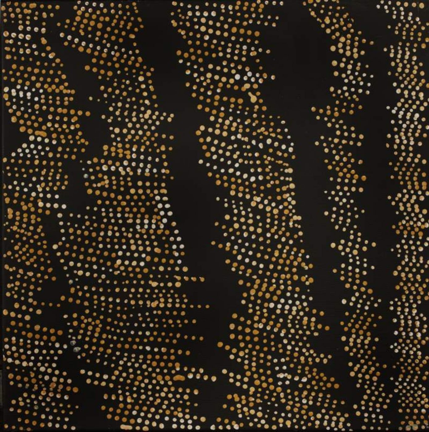 The ‘kirda’ (owners) of this country are Napangardi/Napanangka women and Japangardi/Japanangka men, who can depict portions of the Mina Mina Jukurrpa in their paintings. There are a number of different components of the Mina Mina Jukurrpa; artists usually choose to depict one particular aspect. These can include ‘karnta’ (women), ‘karlangu’ (digging sticks), ‘majardi’ (hairstring skirts/tassels), ‘ngalyipi’ (snakevine [Tinospora smilacina]), ‘jintiparnta’ (desert truffle [Elderia arenivaga]), and ‘kurrkara’ (desert oak [Allocasuarina decaisneana]).