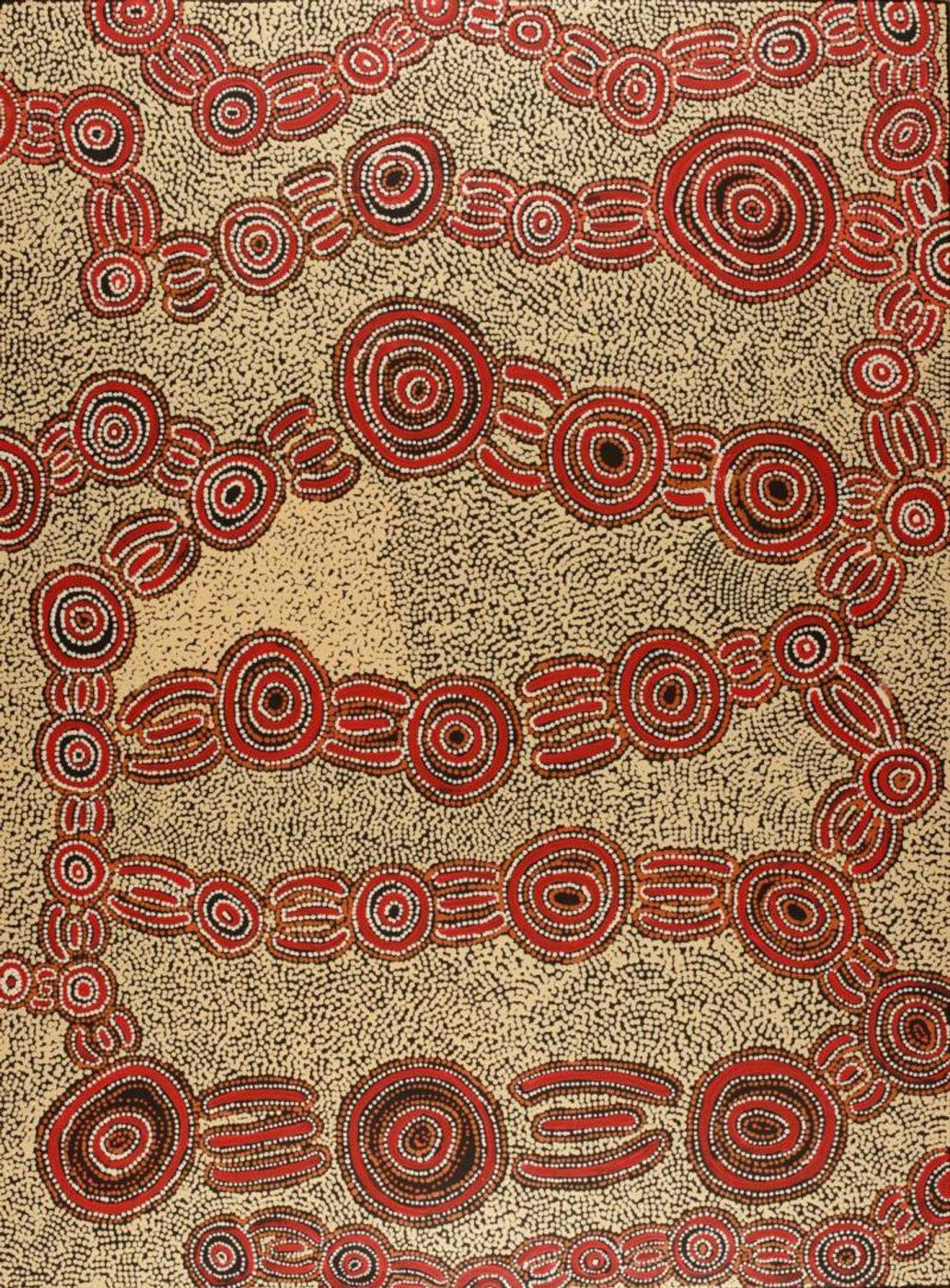 The place depicted in this painting, Ngama, is located south of Yuendumu in the Northern Territory. This Dreaming belongs to Nakamarra/Napurrurla women and Jakamarra/Jupurrurla men. This story describes the journey of Yarripiri, an ancestral ‘warna’ (snake). He travelled from Wirnparrku near Mt. Liebig to Yimparlu, and continued its way through the territories of Ngapanangka-jarra, Warlajirryi, Kurnmundu, Yinyirrinyi on to Ngama. Later Yarripiri travelled further north via Mijirlparnta (Mission Creek) and right through to the top end of Australia.Yarripiri was very sad as his family had left him behind at Wirnparrku. He was blind and crippled but he was determined to follow and search them out. He had to be carried. This was the job undertaken by the ‘kurdungurlu’ (ceremonial police) of the Dreaming: the Nangala/Nampijinpa women and Jangala/Jampijinpa men. Where Yarripiri’s tail slumped and touched the ground creeks were formed, such as Mijirlparnta, west of Yuendumu. Yarripiri tracks and paths are often represented by arc shapes or curved lines depicted across the canvas.