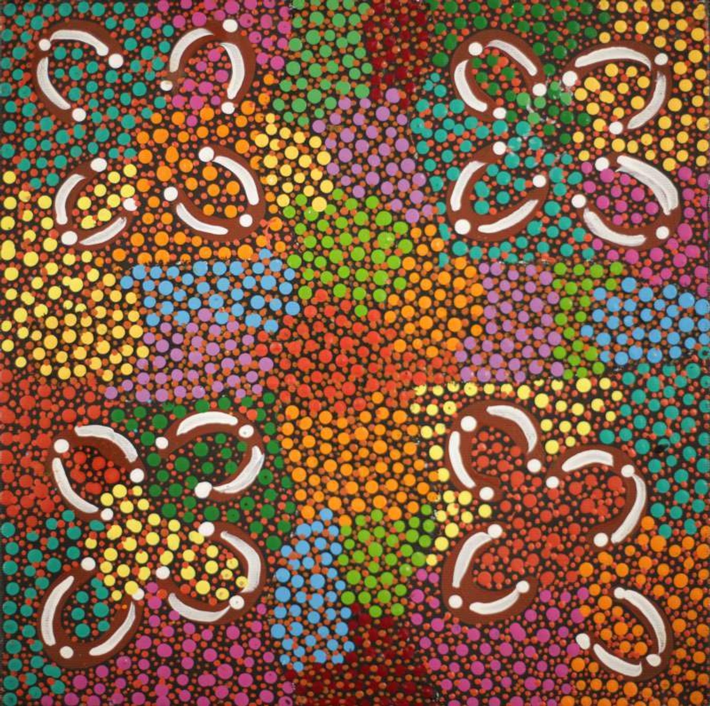 This painting depicts bush tucker, food collected by karnta (women) while out hunting. There is a wide variety of traditional food that warlpiri people continue to gather and consume as a part of their diet. Many of the foods have their own Jukurrpa (dreaming) associated with them. Some of the common bush tucker foods are ngarlkirdi (witchetty grub), wanakiji (bush tomato), yarla (bush potato), janmarda (bush onion), ngarlajiyi (bush carrot), Lukarrara (fringe rush seed), and yuparli (bush banana)