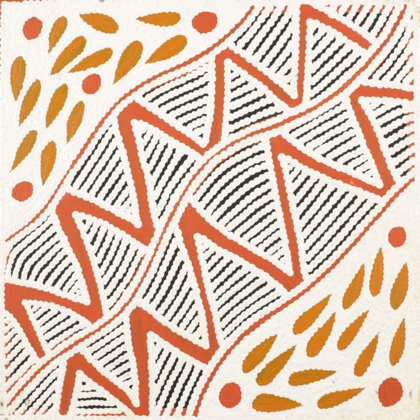 Pikilyi is a large and important waterhole and natural spring near Mount Doreen station. Pikilyi Jukurrpa (Vaughan Springs Dreaming) tells of the home of two rainbow serpents, ancestral heroes who lived together as man and wife. The woman ‘rainbow serpent’ was of the Napanangka skin group, the man was a Japangardi. This was a taboo relationship contrary to Warlpiri religious law. Women of the Napanangka and Napangardi subsection sat by the two serpents, picking lice off them. For this service, the two serpents allowed the women to take water from the springs at Pikilyi. This was because the serpents were the ‘kirda’, or ceremonial owners, for that country. The spirits of these two rainbow serpents are still at Pikilyi today. This Dreamings belongs to the women and men of the Japanangka/Napanangka and Japangardi/Napangardi skin groups.