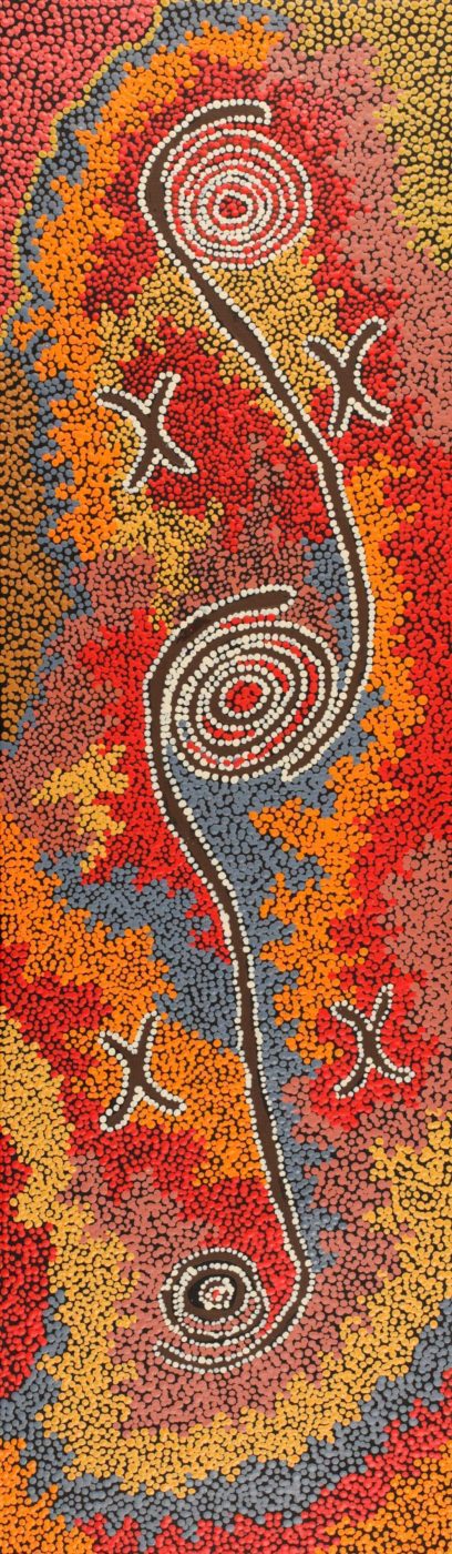 In contemporary Warlpiri paintings, traditional iconography can be used to represent the Jukurrpa, particular sites, and other elements. Paintings of the ‘Pirlarla Jukurrpa’ often include designs that are painted onto women’s bodies during their Yawulyu ceremonies. Long sinuous lines represent the ‘pirlarla’ (bush beans), while round circles represent the ‘wakirlpirri’ (dogwood trees) that they grow on. Shorter curved lines can represent small ‘pirlarla.’
