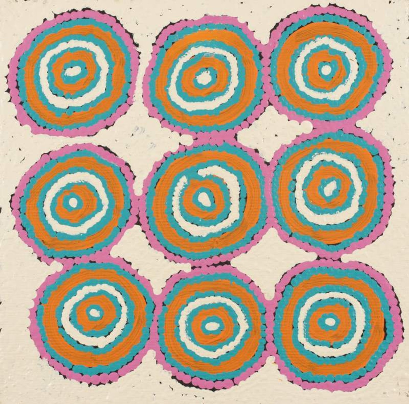 The place depicted in this painting, Ngama, is located south of Yuendumu in the Northern Territory. This Dreaming belongs to Nakamarra/Napurrurla women and Jakamarra/Jupurrurla men. This story describes the journey of Yarripiri, an ancestral ‘warna’ (snake). He travelled from Wirnparrku near Mt. Liebig to Yimparlu, and continued its way through the territories of Ngapanangka-jarra, Warlajirryi, Kurnmundu, Yinyirrinyi on to Ngama. Later Yarripiri travelled further north via Mijirlparnta (Mission Creek) and right through to the top end of Australia.Yarripiri was very sad as his family had left him behind at Wirnparrku. He was blind and crippled but he was determined to follow and search them out. He had to be carried. This was the job undertaken by the ‘kurdungurlu’ (ceremonial police) of the Dreaming: the Nangala/Nampijinpa women and Jangala/Jampijinpa men. Where Yarripiri’s tail slumped and touched the ground creeks were formed, such as Mijirlparnta, west of Yuendumu. Yarripiri tracks and paths are often represented by arc shapes or curved lines depicted across the canvas.