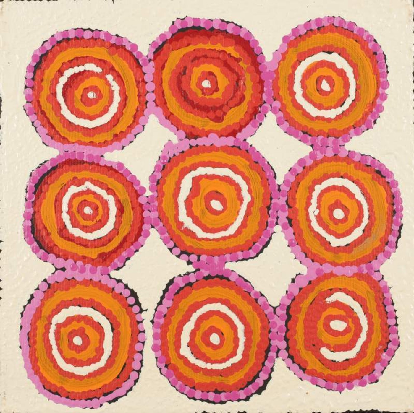 The place depicted in this painting, Ngama, is located south of Yuendumu in the Northern Territory. This Dreaming belongs to Nakamarra/Napurrurla women and Jakamarra/Jupurrurla men. This story describes the journey of Yarripiri, an ancestral ‘warna’ (snake). He travelled from Wirnparrku near Mt. Liebig to Yimparlu, and continued its way through the territories of Ngapanangka-jarra, Warlajirryi, Kurnmundu, Yinyirrinyi on to Ngama. Later Yarripiri travelled further north via Mijirlparnta (Mission Creek) and right through to the top end of Australia.Yarripiri was very sad as his family had left him behind at Wirnparrku. He was blind and crippled but he was determined to follow and search them out. He had to be carried. This was the job undertaken by the ‘kurdungurlu’ (ceremonial police) of the Dreaming: the Nangala/Nampijinpa women and Jangala/Jampijinpa men. Where Yarripiri’s tail slumped and touched the ground creeks were formed, such as Mijirlparnta, west of Yuendumu. Yarripiri tracks and paths are often represented by arc shapes or curved lines depicted across the canvas.