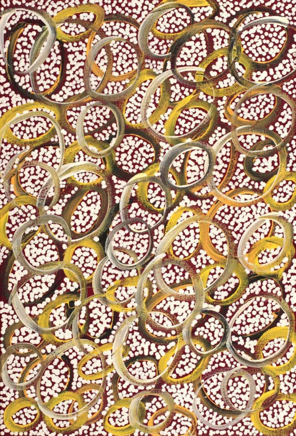 Cherylyn Napangardi frequently goes travelling throughout Australia and is often inspired by the landscapes, animals and varying colours that different parts of the country have to offer. Cherylyn takes this inspiration and uses it to create her artworks allowing the changing flora and fauna to influence what she paints when back in Yuendumu.