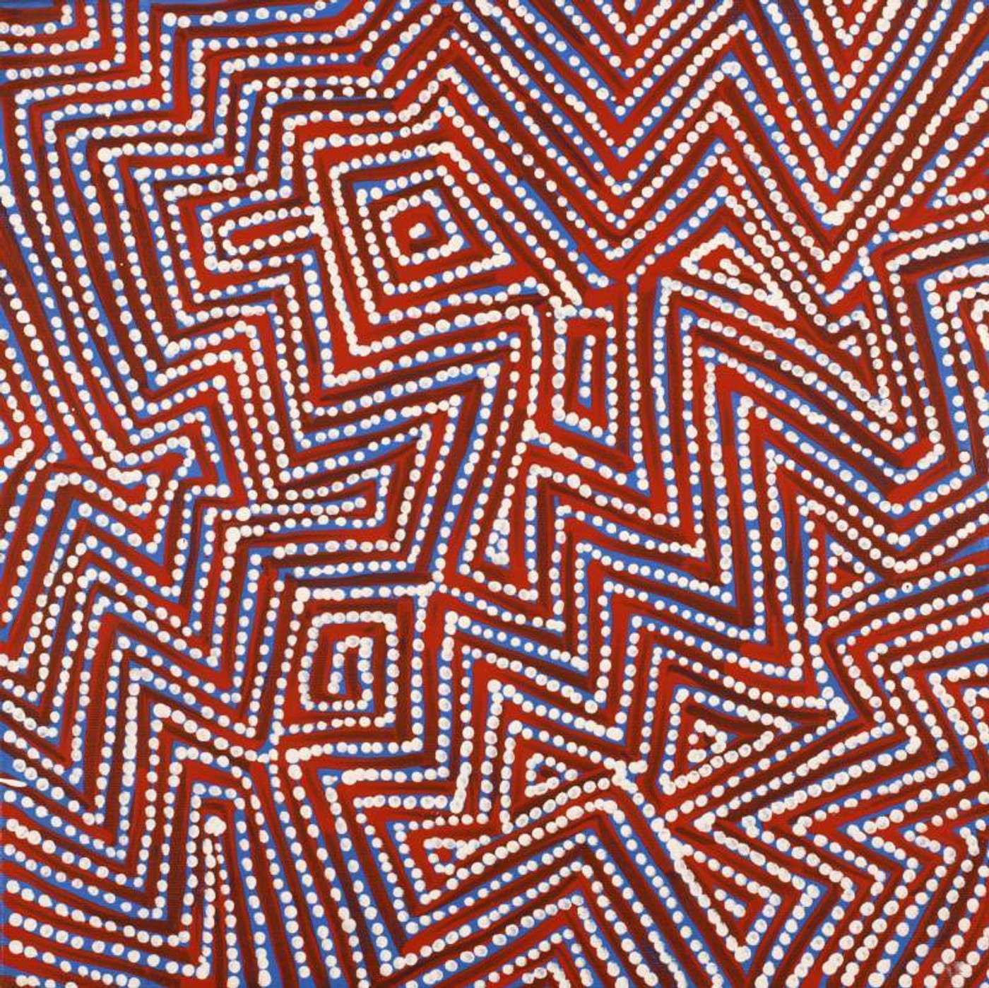 This painting depicts the Pamapardu Jukurrpa (Flying Ant Dreaming) from Warntungurru, west of Yuendumu. ‘Pamapardu’ is the Warlpiri name for the flying ants or termites that build the large anthills found throughout Warlpiri country. This country belongs to Nakamarra/Napurrurla women and Jakamarra/Jupurrurla men. ‘Pamapardu’ are flying ants. They build earth mounds (‘mingkirri’) that are common in the Tanami area. When heavy rains come in summer the ‘mingkirri’ get flooded out, so the ‘pamapardu’ grow wings and fly off to make new homes, following their queens to dry mounds or to build a new. When they have found their new home they drop their wings. In this stage they can be collected, lightly cooked in coals and eaten. As they fall to the ground women collect them to eat because they are nice and sweet. In contemporary Warlpiri paintings traditional iconography is used to represent the Jukurrpa, particular sites and other elements. When this Jukurrpa story is painted concentric circles are used to represent the ‘mingkirri’ and the rockholes involved in the story, including the central one at Wapurtali (Mt Singleton). Dashes are often depicted around the circles to represent the ‘pamapardu’.