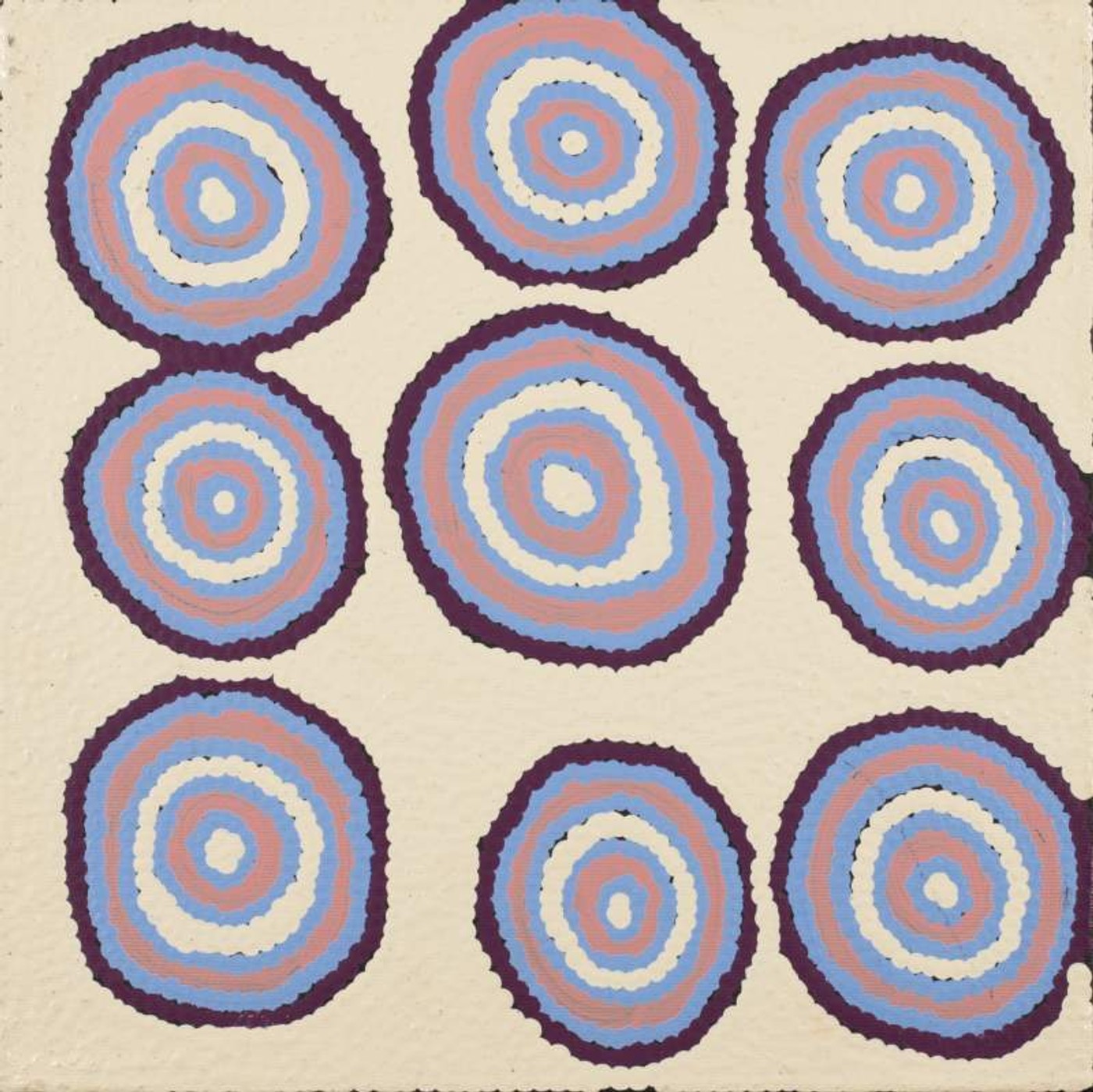 The place depicted in this painting, Ngama, is located south of Yuendumu in the Northern Territory. This Dreaming belongs to Nakamarra/Napurrurla women and Jakamarra/Jupurrurla men. This story describes the journey of Yarripiri, an ancestral ‘warna’ (snake). He travelled from Wirnparrku near Mt. Liebig to Yimparlu, and continued its way through the territories of Ngapanangka-jarra, Warlajirryi, Kurnmundu, Yinyirrinyi on to Ngama. Later Yarripiri travelled further north via Mijirlparnta (Mission Creek) and right through to the top end of Australia.Yarripiri was very sad as his family had left him behind at Wirnparrku. He was blind and crippled but he was determined to follow and search them out. He had to be carried. This was the job undertaken by the ‘kurdungurlu’ (ceremonial police) of the Dreaming: the Nangala/Nampijinpa women and Jangala/Jampijinpa men. Where Yarripiri’s tail slumped and touched the ground creeks were formed, such as Mijirlparnta, west of Yuendumu. Yarripiri tracks and paths are often represented by arc shapes or curved lines depicted across the canvas.