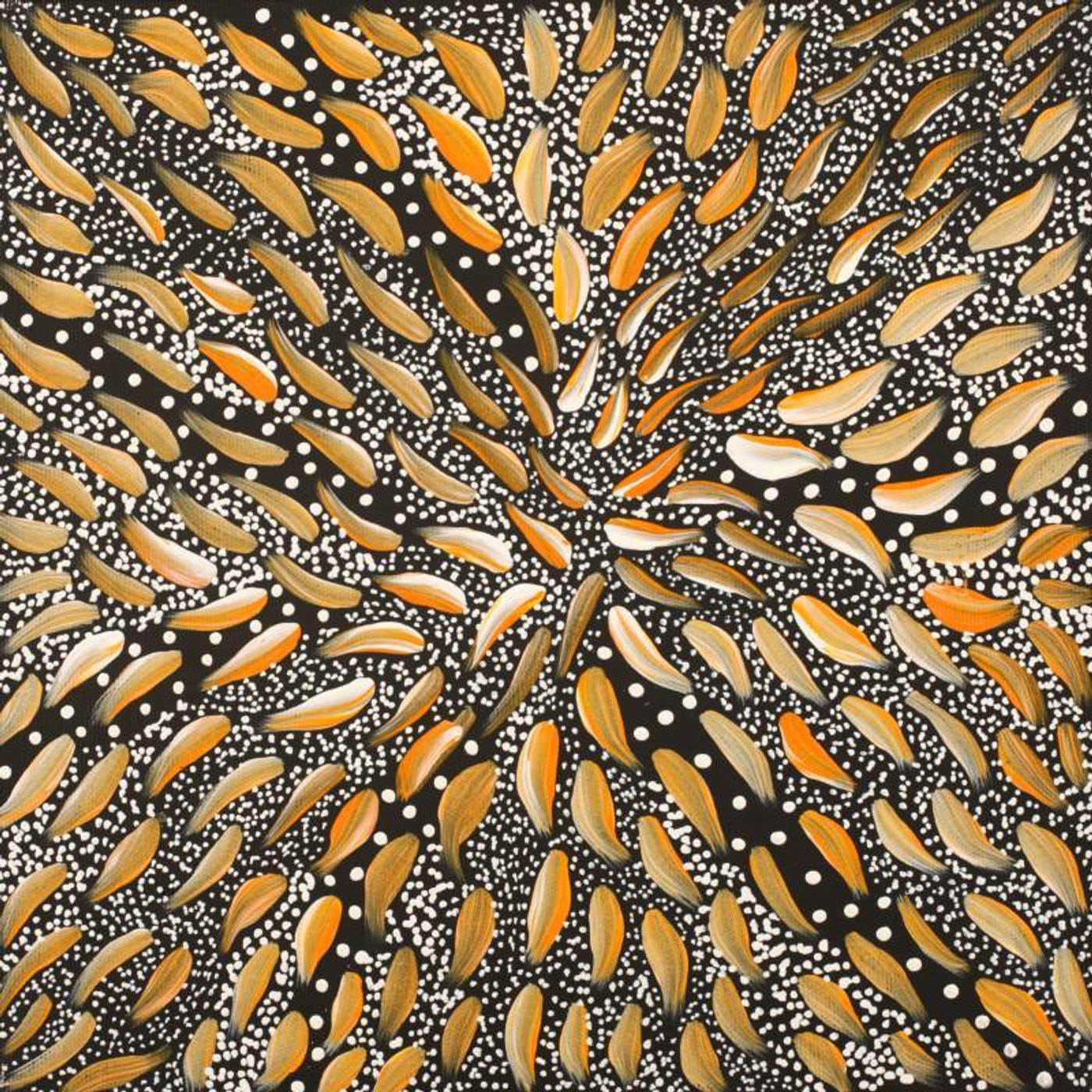 In contemporary Warlpiri paintings, traditional iconography can be used to represent the Jukurrpa, particular sites, and other elements. In paintings of this Jukurrpa, the group of women is often represented by concentric circles and ‘U’ shapes. Concentric circles can also illustrate ‘wardapi’ holes and the droppings they leave, while ‘wardapi’ tracks are usually represented by ‘W’ shapes.