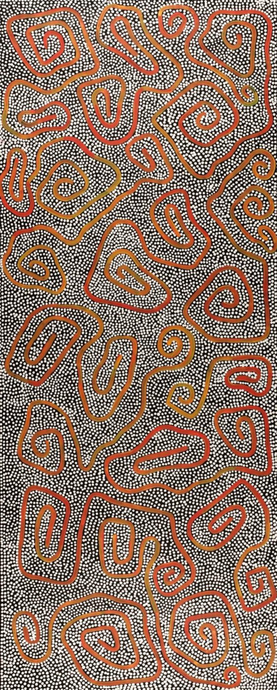 The Yarla Jukurrpa (bush potato [Ipomea costata] Dreaming) tells the story of a fight between ‘yarla’ from Yumurrpa and ‘wapirti’ (bush carrot [Vigna lanceolata]) from Wapurtali. The ‘yarla’ were Jakamarra/Jupurrurla skins and they were in conflict over Napaljarri/Napanangka women, who have the right skin for marriage. The fight took place at ‘Ngardirpi. Many men died, their bodies are now sand hills and their blood formed a water soak. ‘Yarla’ are fibrous tubers that grow beneath a low spreading plant, found by looking for cracks in the ground. Yarla are good to eat, when cooked they are really soft and tasty. This Dreaming belongs to Jupurrurla/Jakamarra men and Napurrula/Nakamarra women. Nakamarra and Napurrula ‘karnta’ (women) are shown sitting down at Yumurrpa gathering ‘yarla’ with ‘karlangu’ (digging sticks) and placing them in ‘parraja’ (wooden carrying dishes). In contemporary Warlpiri paintings traditional iconography is used to represent the Jukurrpa, associated sites and other elements. In paintings of this Jukurrpa women are usually depicted by ‘U’ shapes while the ‘yarla’ plants are represented by concentric circles. The ‘watarlapi’ (the lateral ‘yarla’ roots) are shown across the painting, to symbolize the way this Jukurrpa is spread through Warlpiri country.