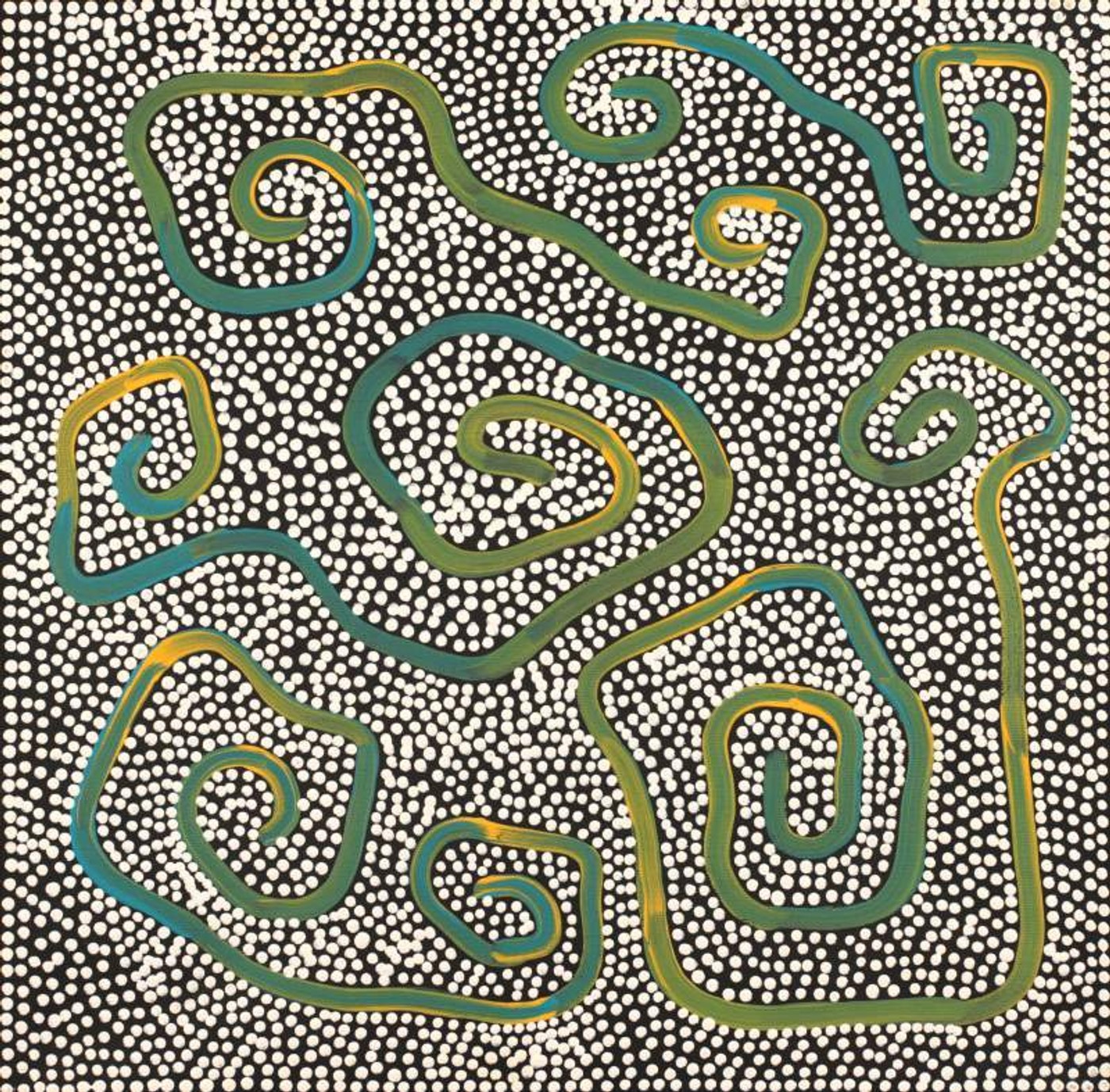 The Yarla Jukurrpa (bush potato [Ipomea costata] Dreaming) tells the story of a fight between ‘yarla’ from Yumurrpa and ‘wapirti’ (bush carrot [Vigna lanceolata]) from Wapurtali. The ‘yarla’ were Jakamarra/Jupurrurla skins and they were in conflict over Napaljarri/Napanangka women, who have the right skin for marriage. The fight took place at ‘Ngardirpi. Many men died, their bodies are now sand hills and their blood formed a water soak. ‘Yarla’ are fibrous tubers that grow beneath a low spreading plant, found by looking for cracks in the ground. Yarla are good to eat, when cooked they are really soft and tasty. This Dreaming belongs to Jupurrurla/Jakamarra men and Napurrula/Nakamarra women. Nakamarra and Napurrula ‘karnta’ (women) are shown sitting down at Yumurrpa gathering ‘yarla’ with ‘karlangu’ (digging sticks) and placing them in ‘parraja’ (wooden carrying dishes). In contemporary Warlpiri paintings traditional iconography is used to represent the Jukurrpa, associated sites and other elements. In paintings of this Jukurrpa women are usually depicted by ‘U’ shapes while the ‘yarla’ plants are represented by concentric circles. The ‘watarlapi’ (the lateral ‘yarla’ roots) are shown across the painting, to symbolize the way this Jukurrpa is spread through Warlpiri country.