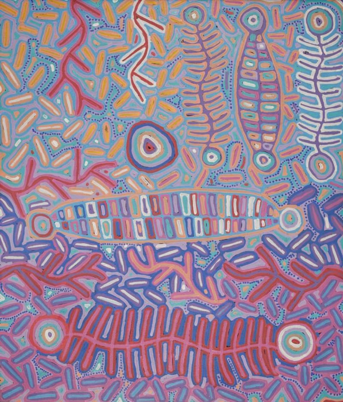 This painting depicts ‘malikijarra Jukurrpa’ (two dogs Dreaming). The ‘kirda’ (owners) of this Dreaming are Nampijinpa/Nangala women and Jampijinpa/Jangala men.