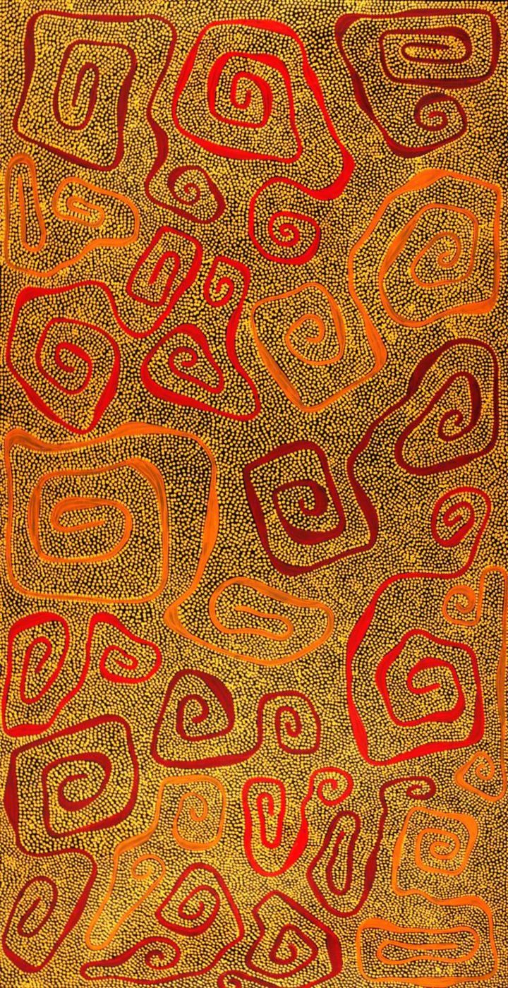 The Yarla Jukurrpa (bush potato [Ipomea costata] Dreaming) tells the story of a fight between ‘yarla’ from Yumurrpa and ‘wapirti’ (bush carrot [Vigna lanceolata]) from Wapurtali. The ‘yarla’ were Jakamarra/Jupurrurla skins and they were in conflict over Napaljarri/Napanangka women, who have the right skin for marriage. The fight took place at ‘Ngardirpi. Many men died, their bodies are now sand hills and their blood formed a water soak. ‘Yarla’ are fibrous tubers that grow beneath a low spreading plant, found by looking for cracks in the ground. Yarla are good to eat, when cooked they are really soft and tasty. This Dreaming belongs to Jupurrurla/Jakamarra men and Napurrula/Nakamarra women. Nakamarra and Napurrula ‘karnta’ (women) are shown sitting down at Yumurrpa gathering ‘yarla’ with ‘karlangu’ (digging sticks) and placing them in ‘parraja’ (wooden carrying dishes). In contemporary Warlpiri paintings traditional iconography is used to represent the Jukurrpa, associated sites and other elements. In paintings of this Jukurrpa women are usually depicted by ‘U’ shapes while the ‘yarla’ plants are represented by concentric circles. The ‘watarlapi’ (the lateral ‘yarla’ roots) are shown across the painting, to symbolize the way this Jukurrpa is spread through Warlpiri country.