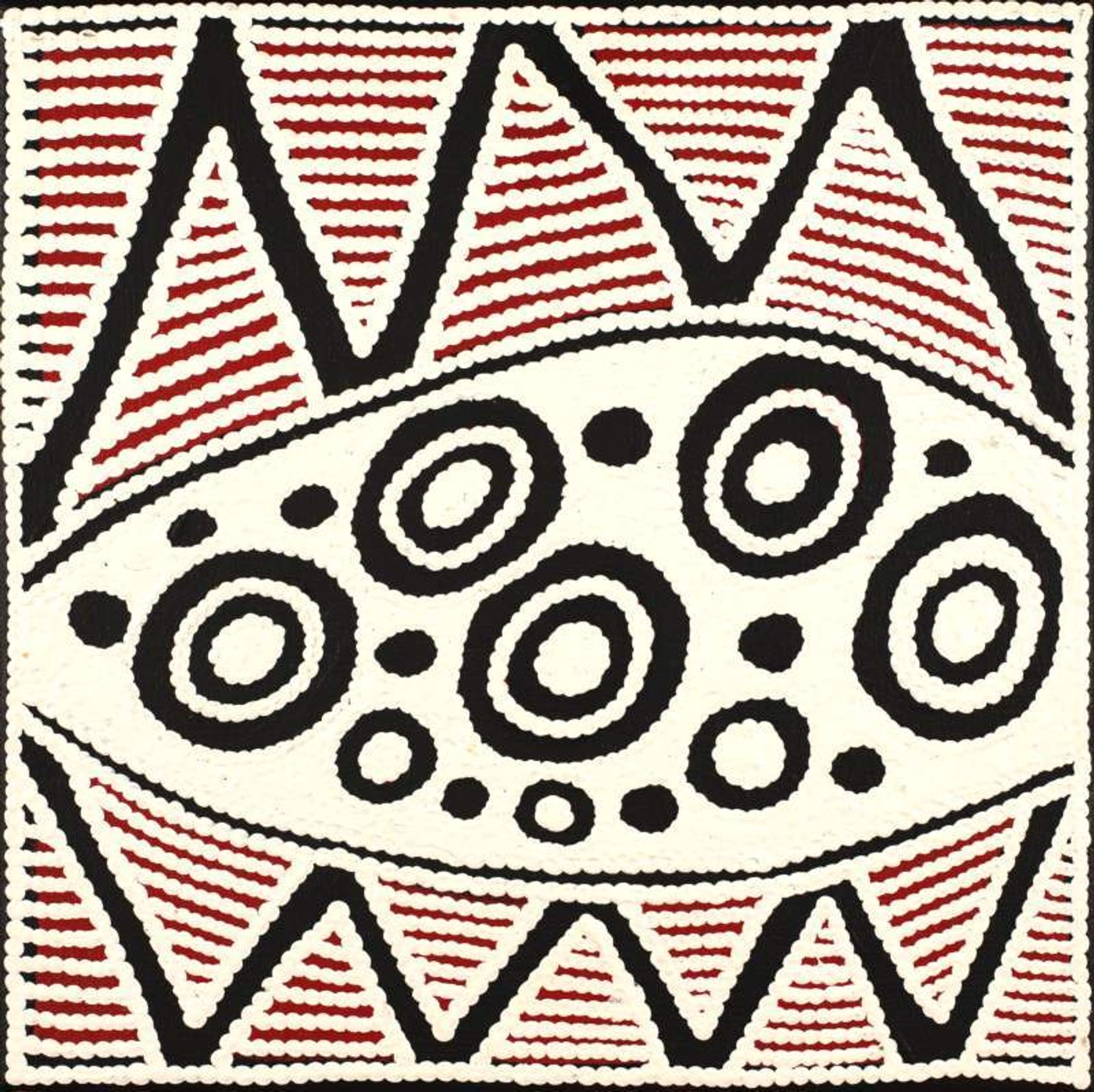 Pikilyi is a large and important waterhole and natural spring near Mount Doreen station. Pikilyi Jukurrpa (Vaughan Springs Dreaming) tells of the home of two rainbow serpents, ancestral heroes who lived together as man and wife. The woman ‘rainbow serpent’ was of the Napanangka skin group, the man was a Japangardi. This was a taboo relationship contrary to Warlpiri religious law. Women of the Napanangka and Napangardi subsection sat by the two serpents, picking lice off them. For this service, the two serpents allowed the women to take water from the springs at Pikilyi. This was because the serpents were the ‘kirda’, or ceremonial owners, for that country. The spirits of these two rainbow serpents are still at Pikilyi today. This Dreamings belongs to the women and men of the Japanangka/Napanangka and Japangardi/Napangardi skin groups.