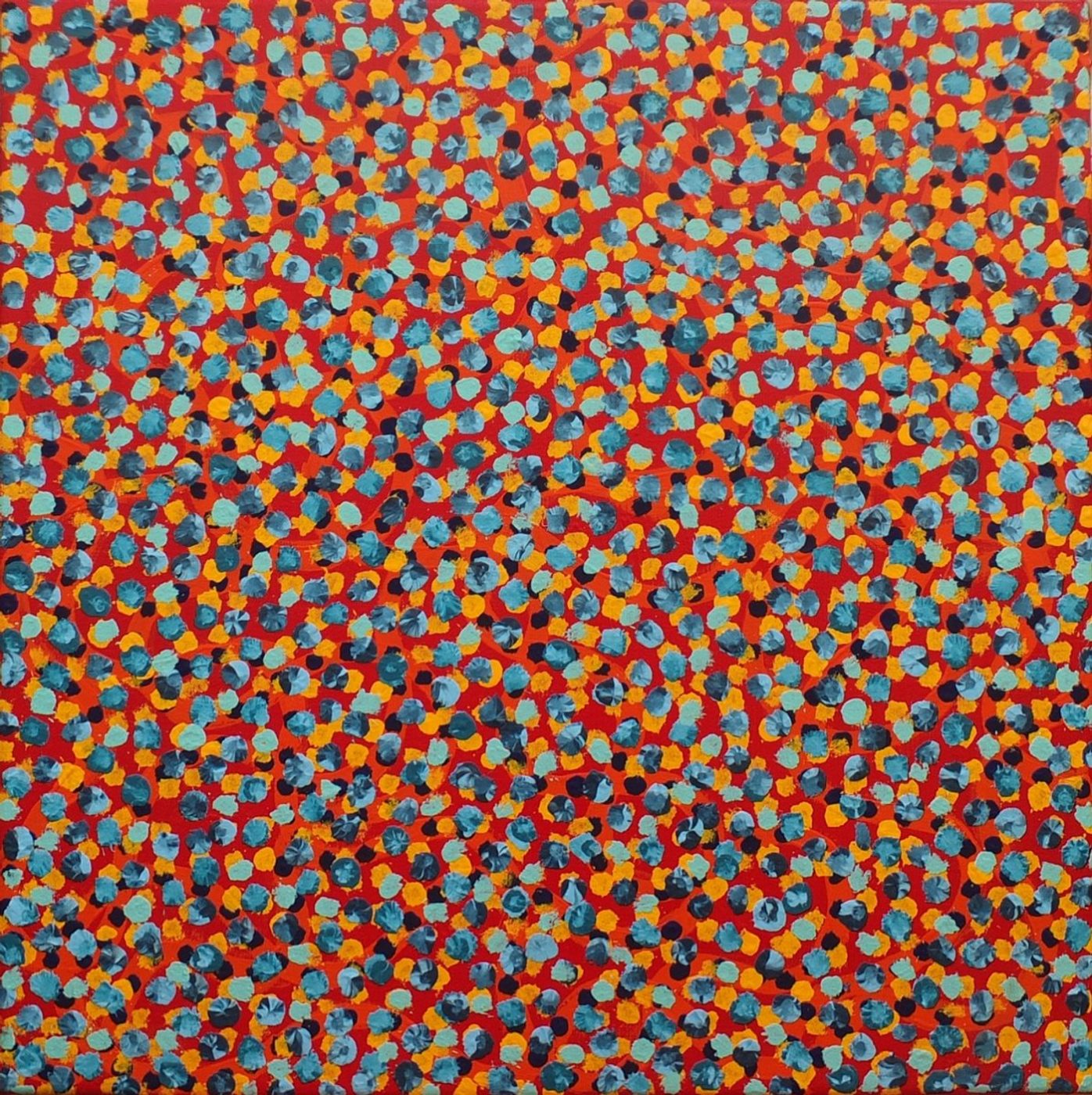 Japaljarri/Jungarrayi men and Napaljarri/Nungarrayi women are the ‘kirda’ (custodians) of the Ngalyipi Jukurrpa (snake vine [Tinospora smilacina]). The country associated with this Jukurrpa is at Yanjirlpiri (Mt. Nicker) to the west of Yuendumu. ‘Ngalyipi’ is a green creeper which curls its tendrils around the trunks and branches of trees and has many uses. Traditionally it was used as a strap to carry ‘parraja’ (wooden food carrying dishes), as a cure for headaches (it was wrapped very tightly around the head), as a rope and as a ceremonial wrap during the ‘witi’ ceremony for the initiation of the sons and grandsons of the Japaljarri and Jungarrayi men. ‘Ngalypi’ was also used to tie ‘witi’ (ceremonial) poles to the legs of the young initiates. The women danced and sang at the ceremony and then had to look away and block their ears when the men danced.