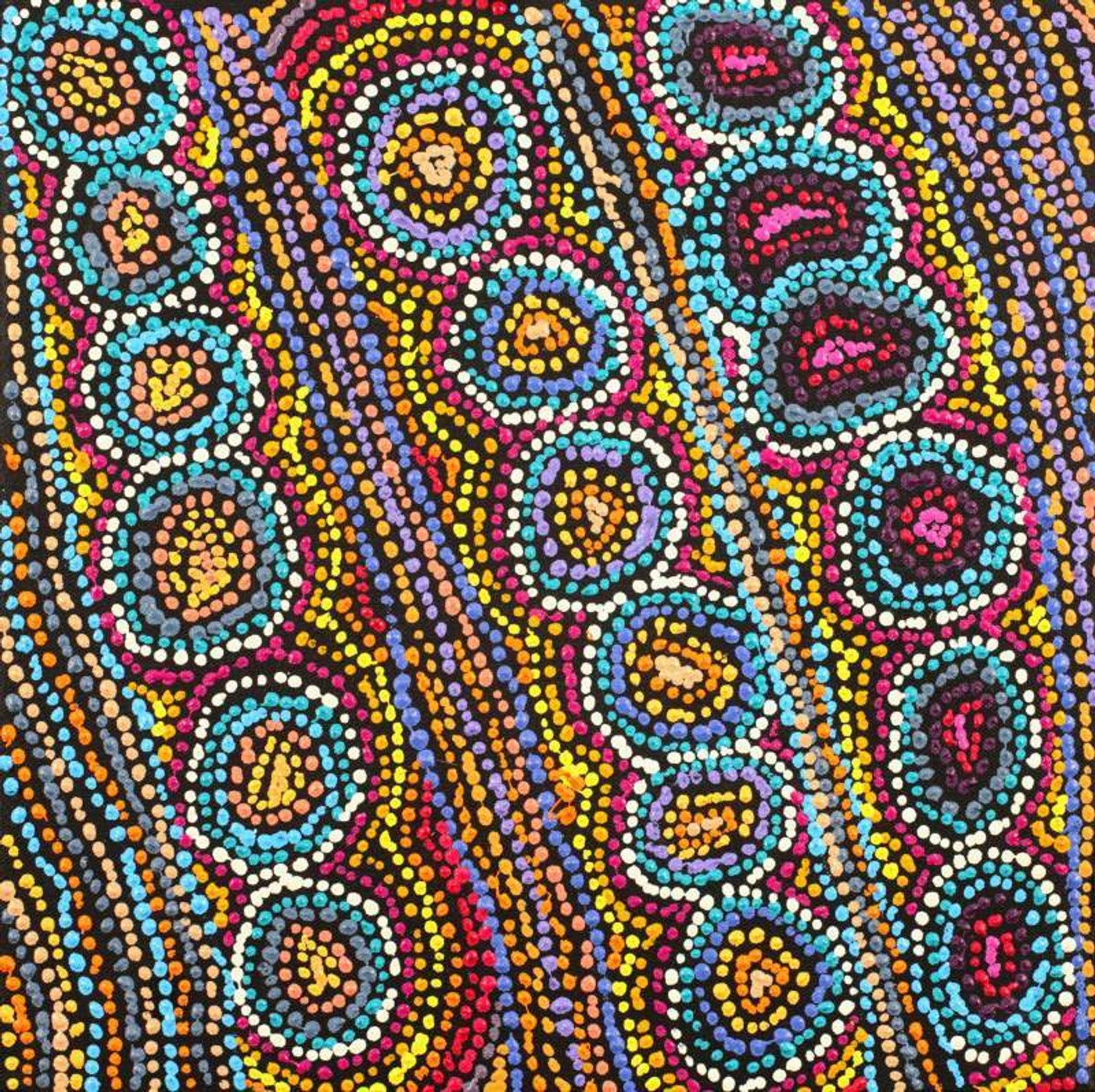 The subject of this work is Lappi Lappi, a rock hole near Lake Hazlett, about 90 km northwest of Lake Mackay in Western Australia. The country belongs to Nampijinpa/Jampijinpa and Nangala/Jangala skin groups. Located in a sheltered basin, the rock hole at Lappi Lappi is a permanent source of water, and is surrounded by country rich in bush tucker. In the time of the Jukurrpa (Dreamtime) many mothers with young children would gather there because it was a safe place to stay. The rock hole at Lappi Lappi is home to a ‘warnayarra’, a rainbow serpent that travels underground between various rock holes. One day, women were gathered at the rock hole with their children, singing and dancing. When the ‘warnayarra’ heard the sound of voices, it travelled silently towards them, under the water. When it reached the edge of the rock hole, it rose out of the water and ate them all.