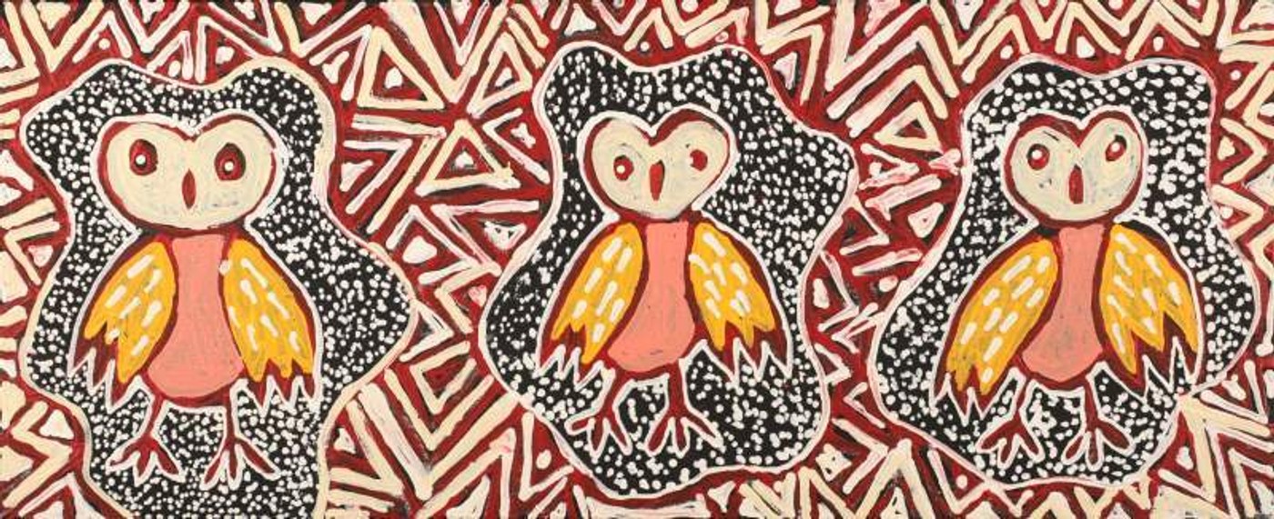 The Jarlajirrpi Jukurrpa (owlet nightjar [Aegotheles cristatus] Dreaming) belongs to country near to Wirliyajarrayi (Willowra community), north of Yuendumu. The ‘jarlajirrpi’ is also known as a ‘kurdaitcha’ (shaman) bird. ‘Jarlajirrpi’ make a particular sound, “Jurl-Jurl”, at nighttime. They spend all day in their nest in the hollow logs of trees and have big eyes, like a ‘kakurtu’ (southern Boobook owl). When people hear the ‘jarlajirrpi’ calling out at night they say to each other “A Kurdaitcha man is coming this way. Look out for him!” This Jukurrpa is associated with ceremonies that are usually performed during the night.