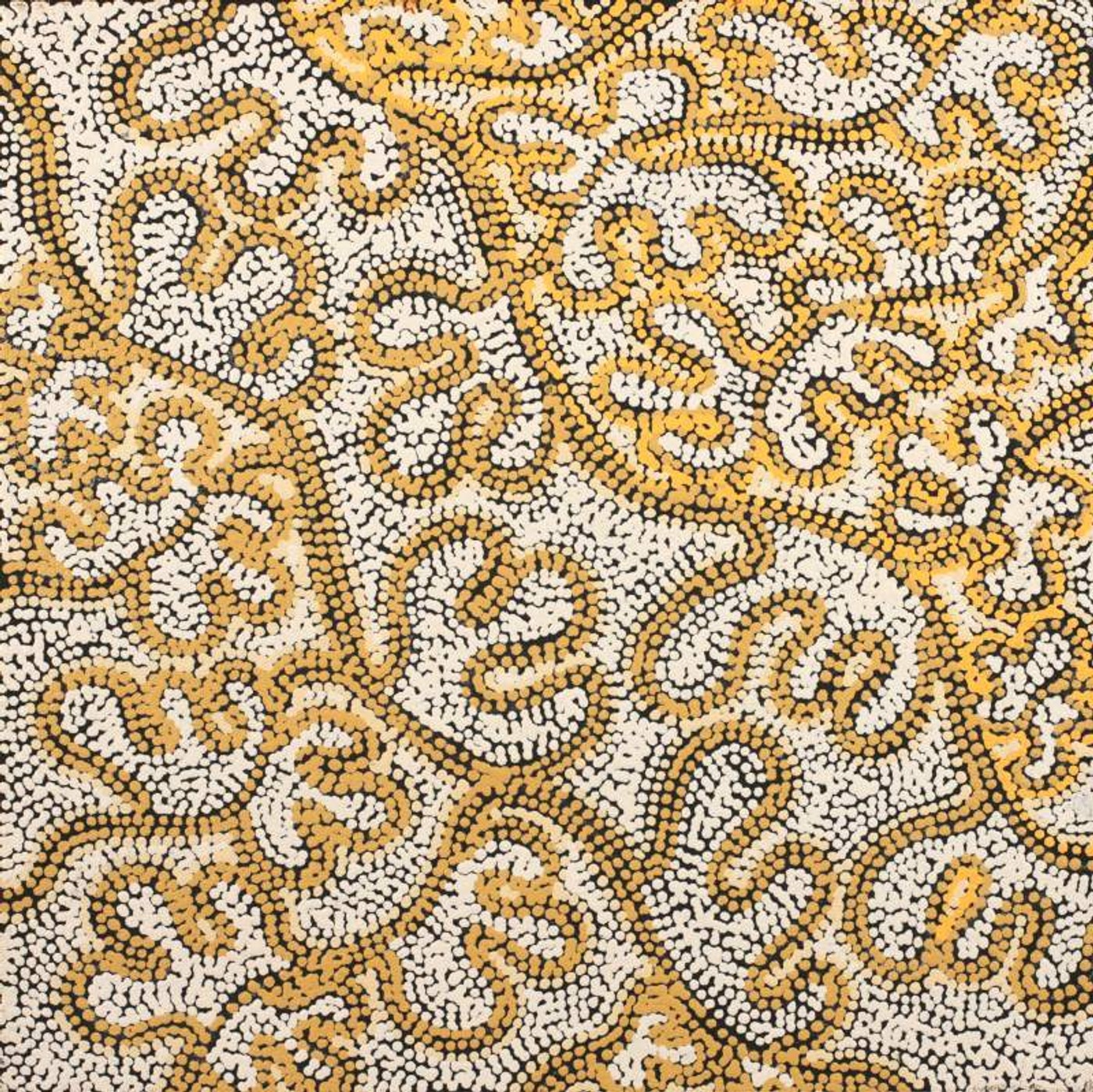 The ‘kirda’ (owners) of this country are Napangardi/Napanangka women and Japangardi/Japanangka men, who can depict portions of the Mina Mina Jukurrpa in their paintings. There are a number of different components of the Mina Mina Jukurrpa; artists usually choose to depict one particular aspect. These can include ‘karnta’ (women), ‘karlangu’ (digging sticks), ‘majardi’ (hairstring skirts/tassels), ‘ngalyipi’ (snakevine [Tinospora smilacina]), ‘jintiparnta’ (desert truffle [Elderia arenivaga]), and ‘kurrkara’ (desert oak [Allocasuarina decaisneana]).