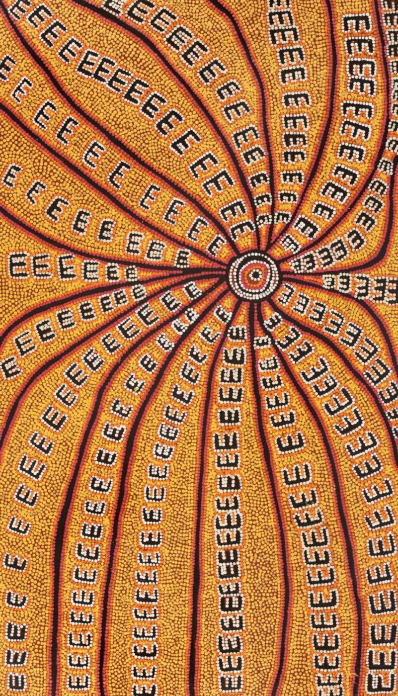 Janganpa Jukurrpa (common brush-tail possum [Trichosurus vulpecula] Dreaming) travels all over Warlpiri country. ‘Janganpa’ are nocturnal animals that often nest in the hollows of white gum trees (‘wapunungka’). This story comes from a big hill called Mawurrji, west of Yuendumu and north of Pikilyi (Vaughan Springs). A group of ‘janganpa’ ancestors resided there. Every night they would go out in search of food. Their hunting trips took them to Wirlki and Wanapirdi, where they found ‘pamapardu’ (flying ants). They journeyed on to Ngarlkirdipini looking for water. A Nampijinpa women was living at Mawurrji with her two daughters. She gave her daughters in marriage to a Jupurrurla ‘janganpa’ but later decided to run away with them. The Jupurrurla angrily pursued the woman. He tracked them to Mawurrji where he killed them with a stone axe. Their bodies are now rocks at this place. Warlpiri people perform a young men’s initiation ceremony, which involves the Janganpa Jukurrpa. The Janganpa Jukurrpa belongs to Jakamarra/Jupurrurla men and Nakamarra/Napurrurla women. In Warlpiri paintings traditional iconography is used to represent this Jukurrpa. ‘Janganpa’ tracks are often represented as ‘E’ shaped figures and concentric circles are used to depict the trees in which the ‘janganpa’ live, and also the sites at Mawurrji.
