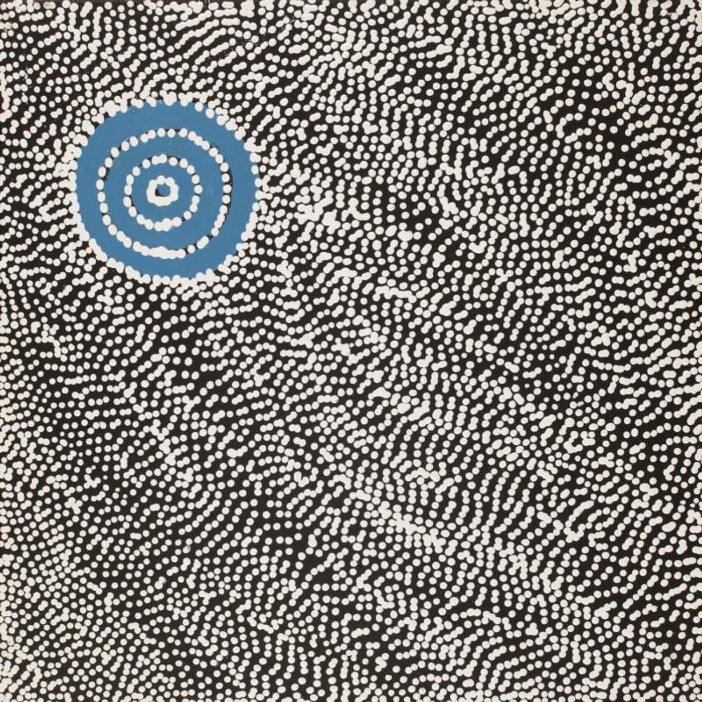 Yanjirlpirri Jukurrpa (Star Dreaming) tells of the journey of Japaljarri and Jungarrayi men who travelled from Kurlurngalinypa (near Lajamanu) to Yanjirlypirri (west of Yuendumu) and then on to Lake Mackay on the West Australian border. Along the way they performed ‘kurdiji’ (initiation ceremonies) for young men. Women also danced for the ‘kurdiji’. The site depicted in this canvas is Yanjirlypiri (star) where there is a low hill and a water soakage. The importance of this place cannot be overemphasized as young boys are brought here to be initiated from as far as Pitjanjatjara country to the south and Lajamanu to the north.