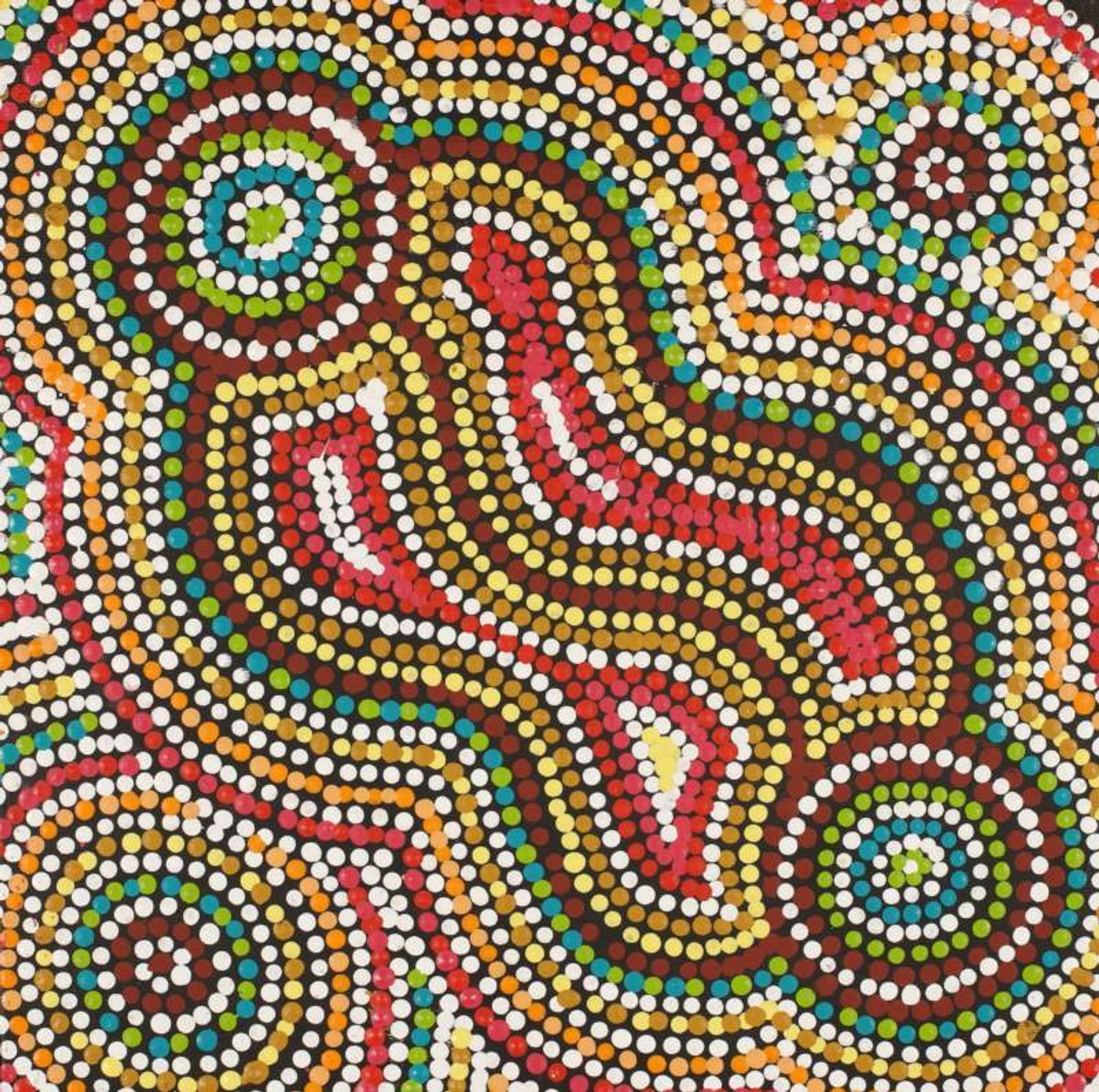 In Warlpiri paintings, traditional iconography is used to represent the Jukurrpa and other elements. Concentric circles are often used to represent the bush foods that the women have collected, while straight lines can be used to depict the ‘karlangu’ (digging sticks). Sinuous lines are often used to represent the ‘ngalyipi’ (snake vine).