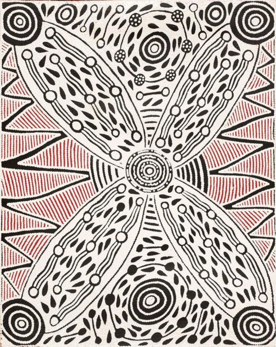 Pikilyi is a large and important waterhole and natural spring near Mount Doreen station. Pikilyi Jukurrpa (Vaughan Springs Dreaming) tells of the home of two rainbow serpents, ancestral heroes who lived together as man and wife. The woman ‘rainbow serpent’ was of the Napanangka skin group, the man was a Japangardi. This was a taboo relationship contrary to Warlpiri religious law. Women of the Napanangka and Napangardi subsection sat by the two serpents, picking lice off them. For this service, the two serpents allowed the women to take water from the springs at Pikilyi. This was because the serpents were the ‘kirda’, or ceremonial owners, for that country. The spirits of these two rainbow serpents are still at Pikilyi today. This Dreamings belongs to the women and men of the Japanangka/Napanangka and Japangardi/Napangardi skin groups.