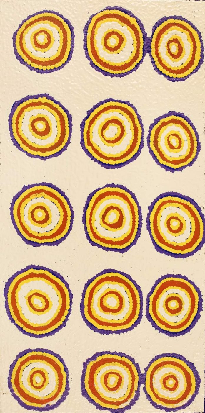 The place depicted in this painting, Ngama, is located south of Yuendumu in the Northern Territory. This Dreaming belongs to Nakamarra/Napurrurla women and Jakamarra/Jupurrurla men. This story describes the journey of Yarripiri, an ancestral ‘warna’ (snake). He travelled from Wirnparrku near Mt. Liebig to Yimparlu, and continued its way through the territories of Ngapanangka-jarra, Warlajirryi, Kurnmundu, Yinyirrinyi on to Ngama. Later Yarripiri travelled further north via Mijirlparnta (Mission Creek) and right through to the top end of Australia.Yarripiri was very sad as his family had left him behind at Wirnparrku. He was blind and crippled but he was determined to follow and search them out. He had to be carried. This was the job undertaken by the ‘kurdungurlu’ (ceremonial police) of the Dreaming: the Nangala/Nampijinpa women and Jangala/Jampijinpa men. Where Yarripiri’s tail slumped and touched the ground creeks were formed, such as Mijirlparnta, west of Yuendumu. Yarripiri tracks and paths are often represented by arc shapes or curved lines depicted across the canvas.