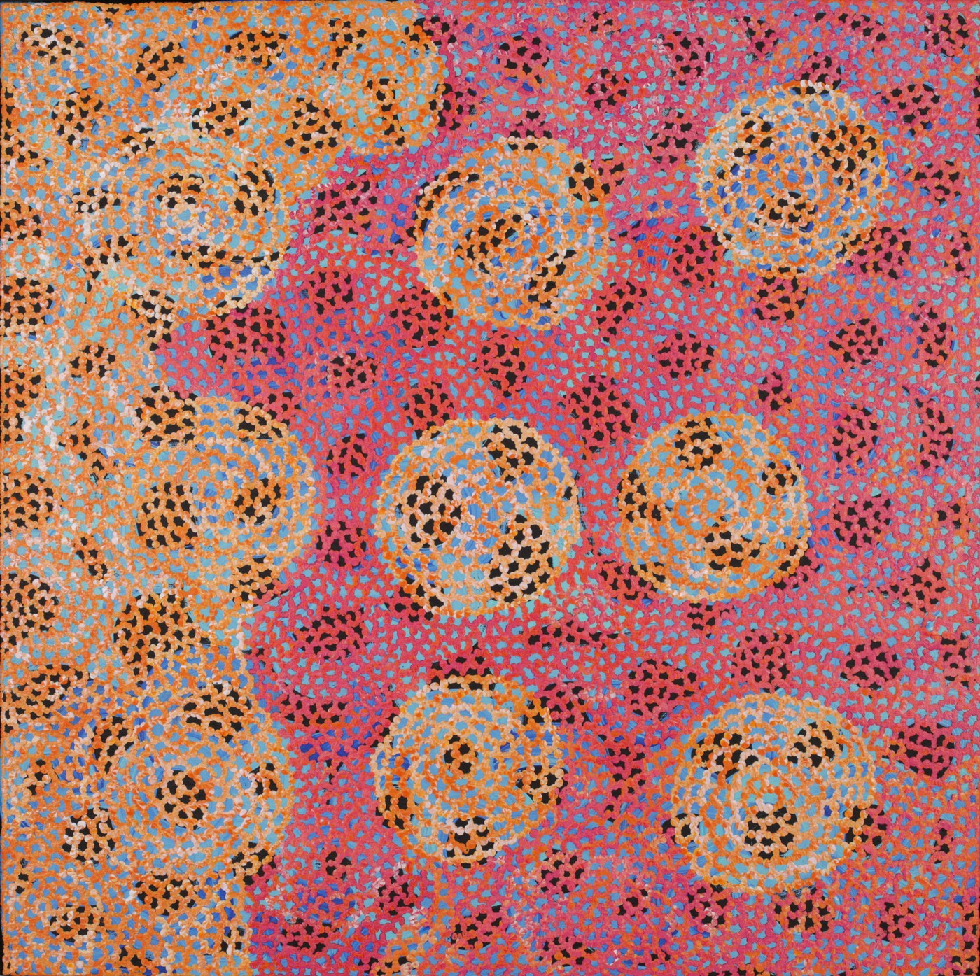 This painting depicts the Pamapardu Jukurrpa (Flying Ant Dreaming) from Wapurtali, west of Yuendumu. ‘Pamapardu’ is the Warlpiri name for the flying ants or termites that build the large anthills found throughout Warlpiri country. This country belongs to Nakamarra/Napurrurla women and Jakamarra/Jupurrurla men. ‘Pamapardu’ are flying ants. They build earth mounds (‘mingkirri’) that are common in the Tanami area. When heavy rains come in summer the ‘mingkirri’ get flooded out, so the ‘pamapardu’ grow wings and fly off to make new homes, following their queens to dry mounds or to build a new. When they have found their new home they drop their wings. In this stage they can be collected, lightly cooked in coals and eaten. As they fall to the ground women collect them to eat because they are nice and sweet. In contemporary Warlpiri paintings traditional iconography is used to represent the Jukurrpa, particular sites and other elements. When this Jukurrpa story is painted concentric circles are used to represent the ‘mingkirri’ and the rockholes involved in the story, including the central one at Wapurtali (Mt Singleton). Dashes are often depicted around the circles to represent the ‘pamapardu’.