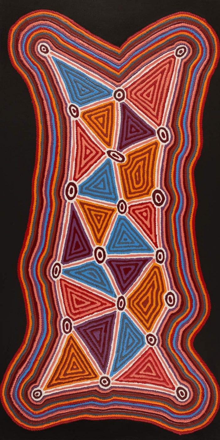 The country associated with this painting is Kiwirkurra, located in the ‘tali’ sandhill country of the Gibson Desert, south west of Lake McKay. The traditional iconography used to represent this dreaming are; concentric circles depicting the rock holes found in this area, the half circles the sandhills and the horizontal wavy lines the lightning. When the lightning comes the water birds, ‘Tjikaluk,’ come out and wade along the edge of the water.