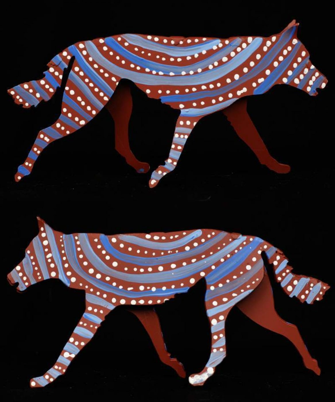 ‘Jarntu’ or ‘maliki’ also feature in a number of ‘Jukurrpa’ (Dreaming) stories. One ‘maliki Jukurrpa’ (dog Dreaming) comes from a site called Pindara, southwest of Yuendumu. Another dog Dreaming story, ‘malikijarra Jukurrpa’ (two dogs Dreaming), comes from country adjacent to Warlarla (Rabbit Flat). This site is part of a long Dreaming track that stretches from Yarrajalpa in the extreme west of Warlpiri country to Warlaku (Ali Curung) in the east. This Dreaming story describes proper conduct in families and marriages.