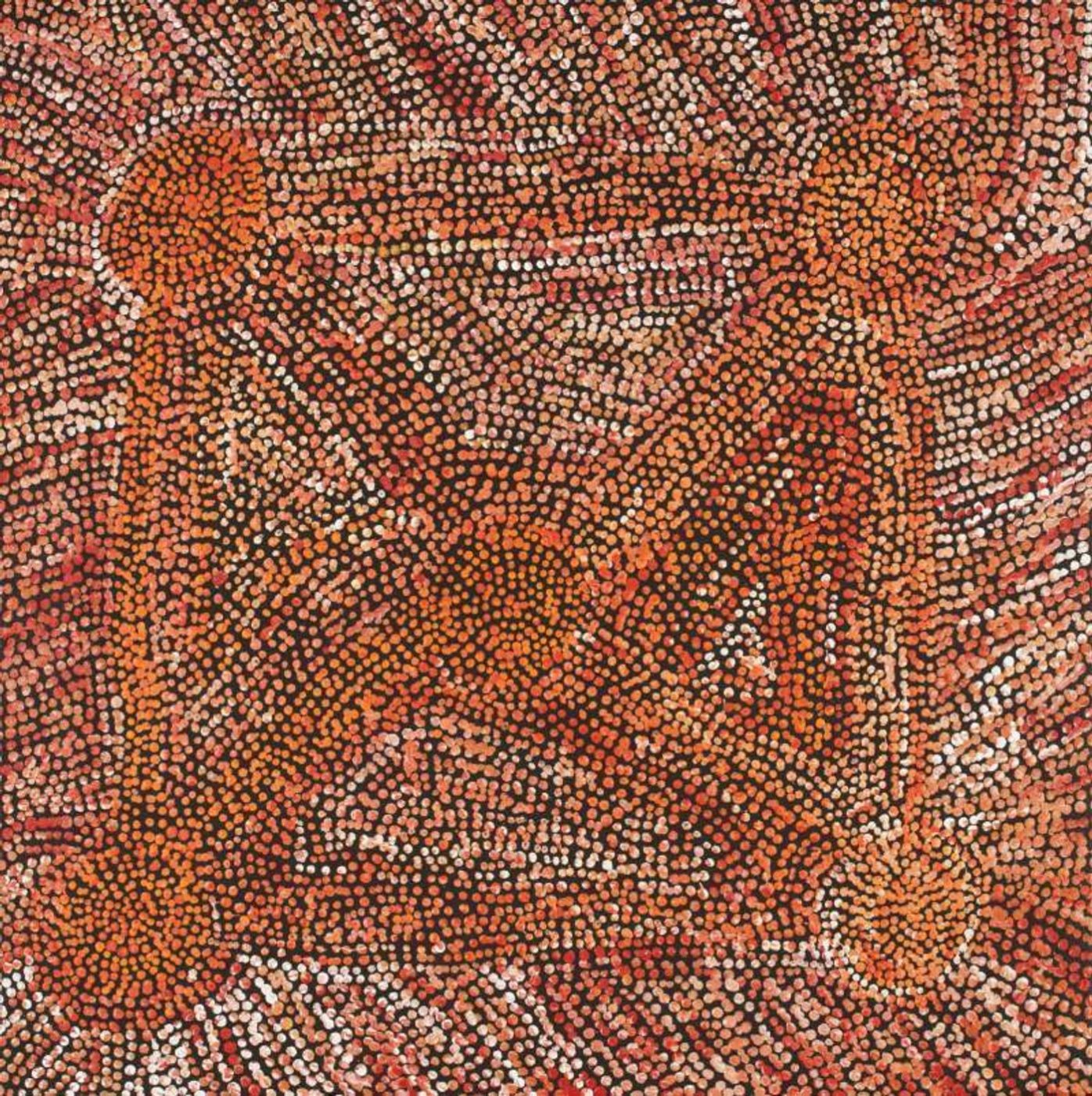 In contemporary Warlpiri paintings, traditional iconography is used to represent the ‘Jukurrpa’ (Dreaming). Short dashes are often used to represent ‘mangkurdu’ (cumulus & stratocumulus clouds), and longer, flowing lines represent ‘ngawarra’ (flood waters). Small circles are used to depict ‘mulju’ (soakages) and river bed.