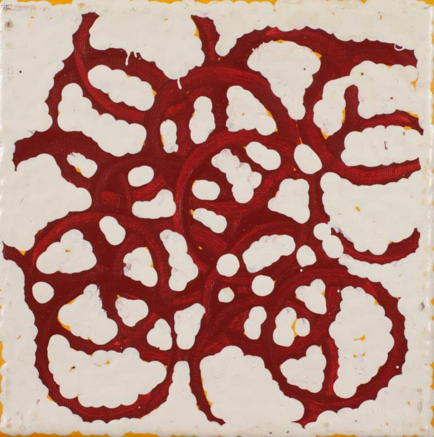 The site depicted in this painting is Puyurru, west of Yuendumu. In the usually dry creek beds are ‘mulju’ (soakages), or naturally occurring wells. The ‘kirda’ (owners) for this site are Nangala/Nampijinpa women and Jangala/Jampijinpa men. Two Jangala men, rainmakers, sang the rain, unleashing a giant storm. The storm travelled across the country from the east to the west, initially travelling with a ‘pamapardu Jukurrpa’ (termite Dreaming) from Warntungurru to Warlura, a waterhole 8 miles east of Yuendumu. At Warlura, a gecko called Yumariyumari blew the storm on to Lapurrukurra and Wilpiri. Bolts of lightning shot out at Wirnpa (also called Mardinymardinypa) and at Kanaralji. At this point the Dreaming track also includes the ‘kurdukurdu mangkurdu Jukurrpa’ (children of the clouds Dreaming). The water Dreaming built hills at Ngamangama using baby clouds and also stuck long pointy clouds into the ground at Jukajuka, where they can still be seen today as rock formations.