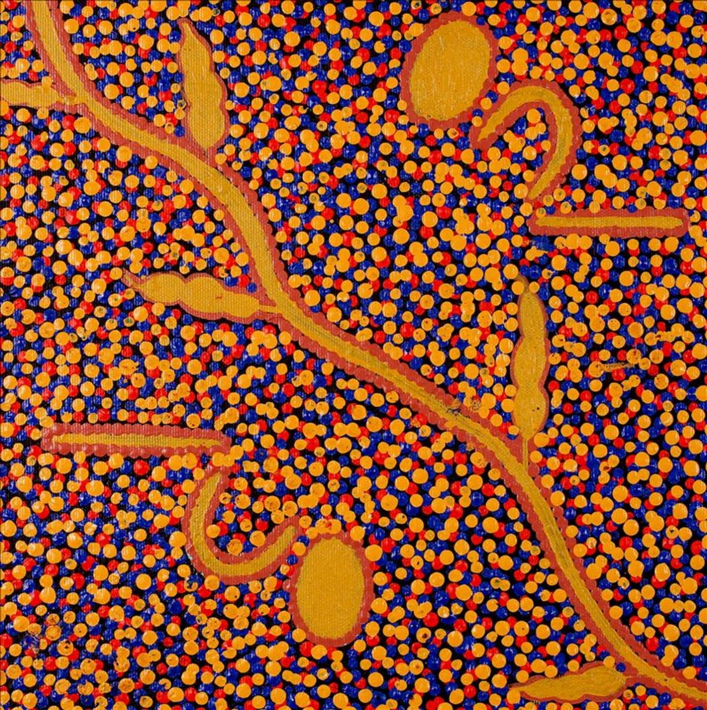 This painting depicts a ‘wardapi Jukurrpa’ (sand monitor/goanna [Varanus gouldii] Dreaming). This dramatic Jukurrpa travels between Purturlu (Mount Theo), approximately 150kms north-northwest of Yuendumu, and Yarripilangu (Newhaven), which is approximately 100kms southwest of Yuendumu. This painting focuses on the portion of the Jukurrpa that takes place at Yarripilangu, which is owned by Napaljarri/Nungarrayi women and Japaljarri/Jungarrayi men. The portion of the Jukurrpa at Purturlu belongs to Napanangka/Napangardi women and Japanangka/Japangardi men.