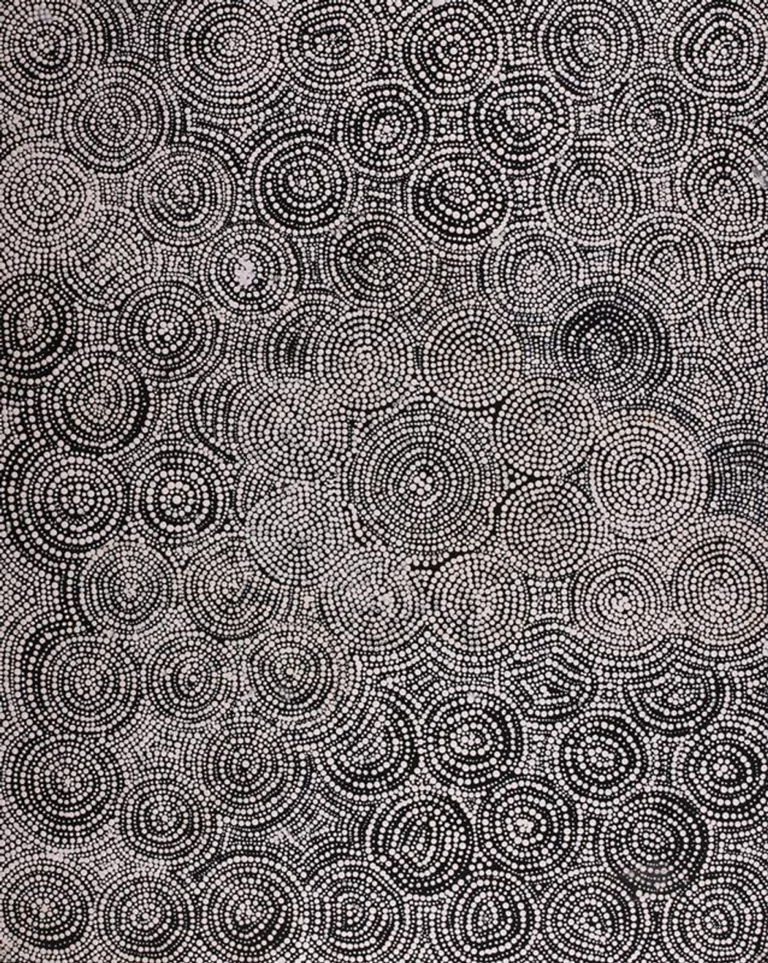 Pikilyi is a large and important waterhole and natural spring near Mount Doreen station. Pikilyi Jukurrpa (Vaughan Springs Dreaming) tells of the home of two rainbow serpents, ancestral heroes who lived together as man and wife. The woman ‘rainbow serpent’ was of the Napanangka skin group, the man was a Japangardi. This was a taboo relationship contrary to Warlpiri religious law. Women of the Napanangka and Napangardi subsection sat by the two serpents, picking lice off them. For this service, the two serpents allowed the women to take water from the springs at Pikilyi. This was because the serpents were the ‘kirda’, or ceremonial owners, for that country. The spirits of these two rainbow serpents are still at Pikilyi today. This Dreamings belongs to the women and men of the Japanangka/Napanangka and Japangardi/Napangardi skin groups.
