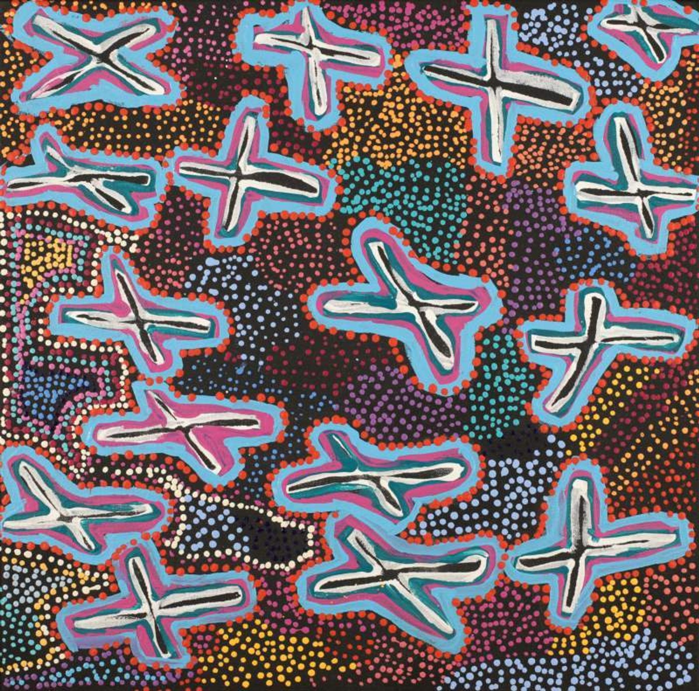 Traditional iconography can be used to depict the sites and birds of this Jukurrpa. the iconography use for the sites and waterholes are concentric circles, while cross-like shapes depict the footprints of the birds on the ground and give an indication of the large flocks of ‘ngatijirri’ that can be found near Yangarnmpi and other sites close to Yuendumu.