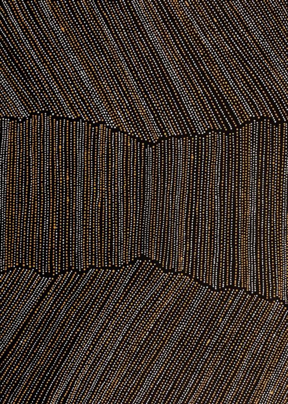 The site depicted in this painting is Puyurru, west of Yuendumu. In the usually dry creek beds are ‘mulju’ (soakages), or naturally occurring wells. The ‘kirda’ (owners) for this site are Nangala/Nampijinpa women and Jangala/Jampijinpa men. Two Jangala men, rainmakers, sang the rain, unleashing a giant storm. The storm travelled across the country from the east to the west, initially travelling with a ‘pamapardu Jukurrpa’ (termite Dreaming) from Warntungurru to Warlura, a waterhole 8 miles east of Yuendumu. At Warlura, a gecko called Yumariyumari blew the storm on to Lapurrukurra and Wilpiri. Bolts of lightning shot out at Wirnpa (also called Mardinymardinypa) and at Kanaralji. At this point the Dreaming track also includes the ‘kurdukurdu mangkurdu Jukurrpa’ (children of the clouds Dreaming). The water Dreaming built hills at Ngamangama using baby clouds and also stuck long pointy clouds into the ground at Jukajuka, where they can still be seen today as rock formations.