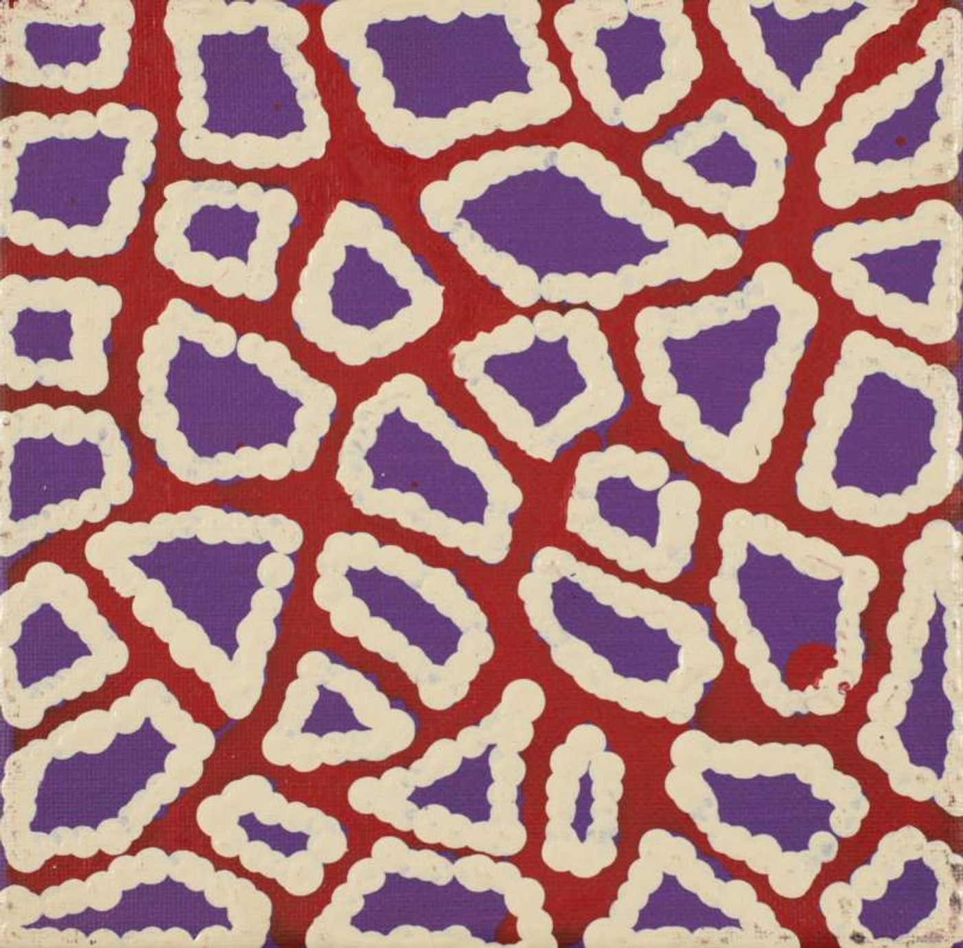 The site depicted in this painting is Puyurru, west of Yuendumu. In the usually dry creek beds are ‘mulju’ (soakages), or naturally occurring wells. The ‘kirda’ (owners) for this site are Nangala/Nampijinpa women and Jangala/Jampijinpa men. Two Jangala men, rainmakers, sang the rain, unleashing a giant storm. The storm travelled across the country from the east to the west, initially travelling with a ‘pamapardu Jukurrpa’ (termite Dreaming) from Warntungurru to Warlura, a waterhole 8 miles east of Yuendumu. At Warlura, a gecko called Yumariyumari blew the storm on to Lapurrukurra and Wilpiri. Bolts of lightning shot out at Wirnpa (also called Mardinymardinypa) and at Kanaralji. At this point the Dreaming track also includes the ‘kurdukurdu mangkurdu Jukurrpa’ (children of the clouds Dreaming). The water Dreaming built hills at Ngamangama using baby clouds and also stuck long pointy clouds into the ground at Jukajuka, where they can still be seen today as rock formations.