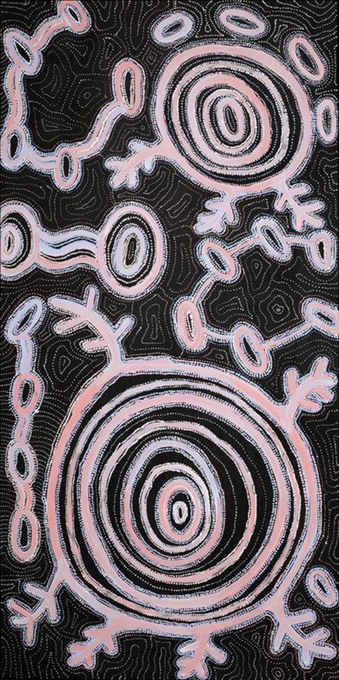 Pikilyi is a large and important waterhole and natural spring near Mount Doreen station. Pikilyi Jukurrpa (Vaughan Springs Dreaming) tells of the home of two rainbow serpents, ancestral heroes who lived together as man and wife. The woman ‘rainbow serpent’ was of the Napanangka skin group, the man was a Japangardi. This was a taboo relationship contrary to Warlpiri religious law. Women of the Napanangka and Napangardi subsection sat by the two serpents, picking lice off them. For this service, the two serpents allowed the women to take water from the springs at Pikilyi. This was because the serpents were the ‘kirda’, or ceremonial owners, for that country. The spirits of these two rainbow serpents are still at Pikilyi today. This Dreamings belongs to the women and men of the Japanangka/Napanangka and Japangardi/Napangardi skin groups.
