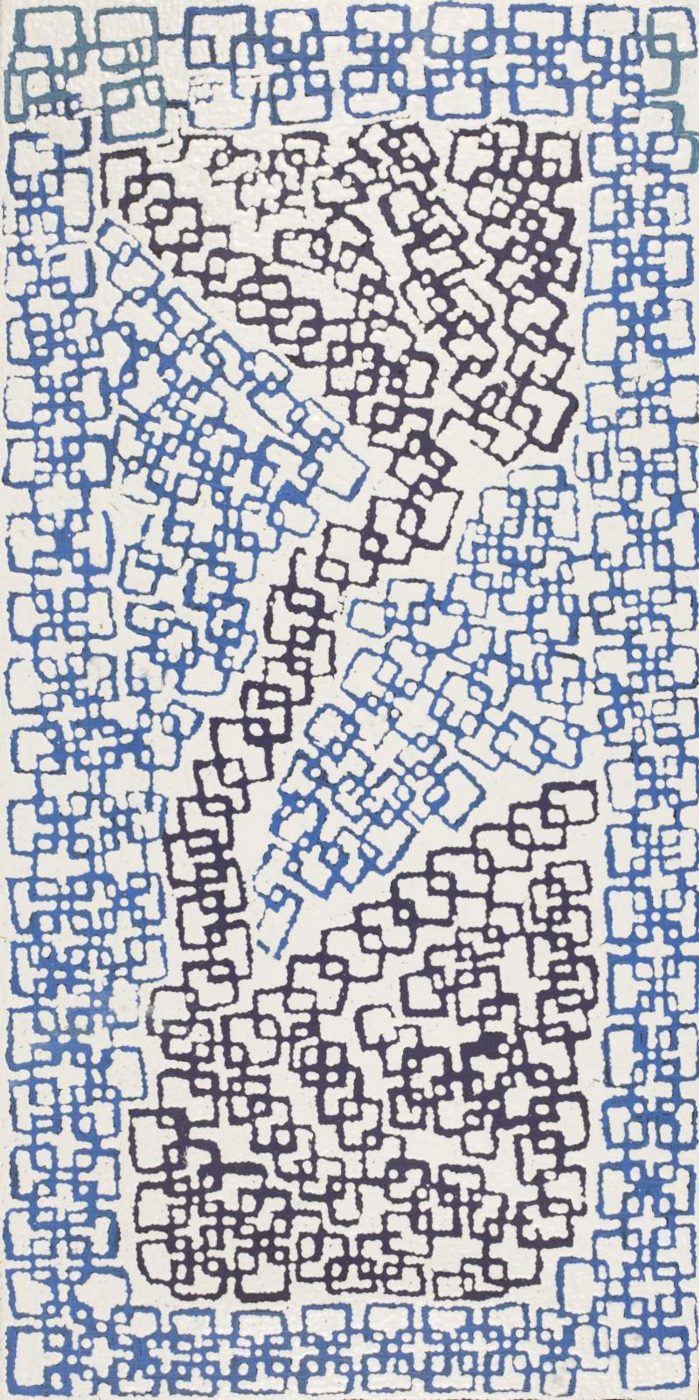 The site depicted in this painting is Puyurru, west of Yuendumu. In the usually dry creek beds are ‘mulju’ (soakages), or naturally occurring wells. The ‘kirda’ (owners) for this site are Nangala/Nampijinpa women and Jangala/Jampijinpa men. Two Jangala men, rainmakers, sang the rain, unleashing a giant storm. The storm travelled across the country from the east to the west, initially travelling with a ‘pamapardu Jukurrpa’ (termite Dreaming) from Warntungurru to Warlura, a waterhole 8 miles east of Yuendumu. At Warlura, a gecko called Yumariyumari blew the storm on to Lapurrukurra and Wilpiri. Bolts of lightning shot out at Wirnpa (also called Mardinymardinypa) and at Kanaralji. At this point the Dreaming track also includes the ‘kurdukurdu mangkurdu Jukurrpa’ (children of the clouds Dreaming). The water Dreaming built hills at Ngamangama using baby clouds and also stuck long pointy clouds into the ground at Jukajuka, where they can still be seen today as rock formations.