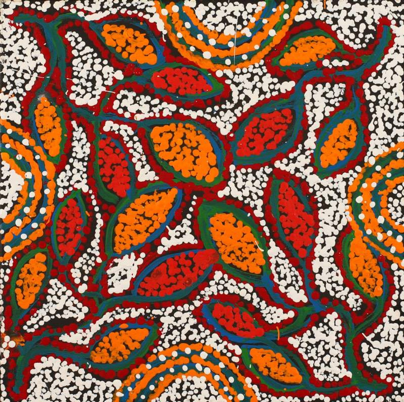 In contemporary Warlpiri paintings, traditional iconography is used to represent the ‘Jukurrpa’ (Dreaming), associated sites, and other elements. In many paintings of this Dreaming, short dashes are often used to represent ‘mangkurdu’ (cumulus & stratocumulus clouds), and longer, flowing lines represent ‘ngawarra’ (flood waters). Small circles are used to depict ‘mulju’ (soakages) and river beds.