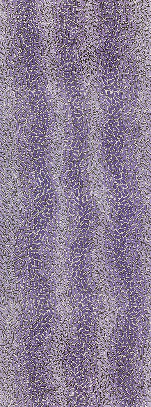 This Dreaming belongs to Warlukurlangu country to the south-west of Yuendumu, for which Jampijinpa/Jangala men and Nampijinpa/Nangala women have custodial responsibility. An old man ‘lungkarda’ (centralian blue-tongued lizard [Tiliqua multifasciata]), of the Jampijinpa skin group, lived on a hill with his two Jangala sons. The old man would feign blindness and send the two boys hunting in search of meat. While they were gone he would hunt and eat anything that he caught before they returned. One day the sons returned with a kangaroo that they had caught after much tracking. Unfortunately the kangaroo was sacred to the ‘lungkarda’, unbeknown to the boys. In his anger the old man decided to punish his sons and the next time they went out, he put his fire stick to the ground and sent a huge bush fire after them which chased them for many miles, at times propelling them through the air. Although the boys beat out the flames, ‘lungkarda’s’ special magic kept the fire alive and it re-appeared out of his blue-tongued lizard hole. Exhausted the boys were finally overcome by the flames. In contemporary Warlpiri paintings traditional iconography is used to represent the Jukurrpa, particular sites and other elements. Usually sites that are depicted in paintings of this Jukurrpa include Warlukurlangu (a men’s cave), Kirrkirrmanu (where the sacred kangaroo was killed), Wayililinypa (where the fire killed the two Jangala sons) and Marnimarnu (a water soakage) where the two Jangalas camped.