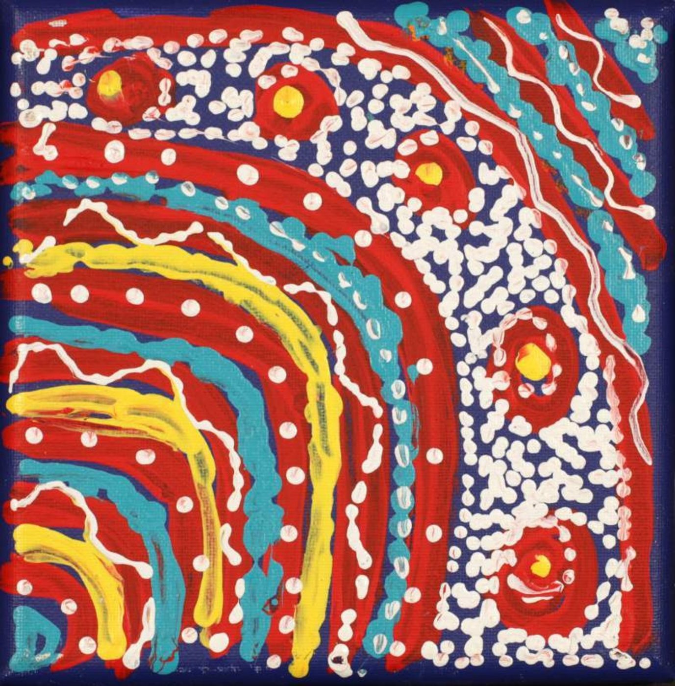 In contemporary Warlpiri paintings, traditional iconography is used to represent the ‘Jukurrpa’ (Dreaming), associated sites, and other elements. In many paintings of this Dreaming, short dashes are often used to represent ‘mangkurdu’ (cumulus & stratocumulus clouds), and longer, flowing lines represent ‘ngawarra’ (flood waters). Small circles are used to depict ‘mulju’ (soakages) and river beds.