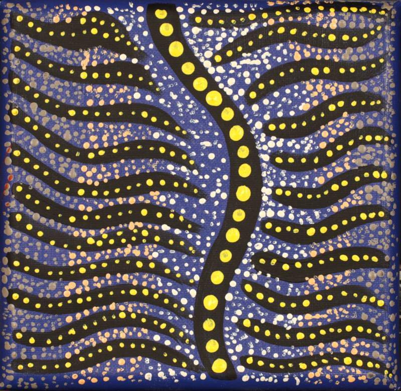 This painting depicts a ‘wardapi Jukurrpa’ (sand monitor/goanna [Varanus gouldii] Dreaming). This dramatic Jukurrpa travels between Purturlu (Mount Theo), approximately 150kms north-northwest of Yuendumu, and Yarripilangu (Newhaven), which is approximately 100kms southwest of Yuendumu. This painting focuses on the portion of the Jukurrpa that takes place at Yarripilangu, which is owned by Napaljarri/Nungarrayi women and Japaljarri/Jungarrayi men. The portion of the Jukurrpa at Purturlu belongs to Napanangka/Napangardi women and Japanangka/Japangardi men.