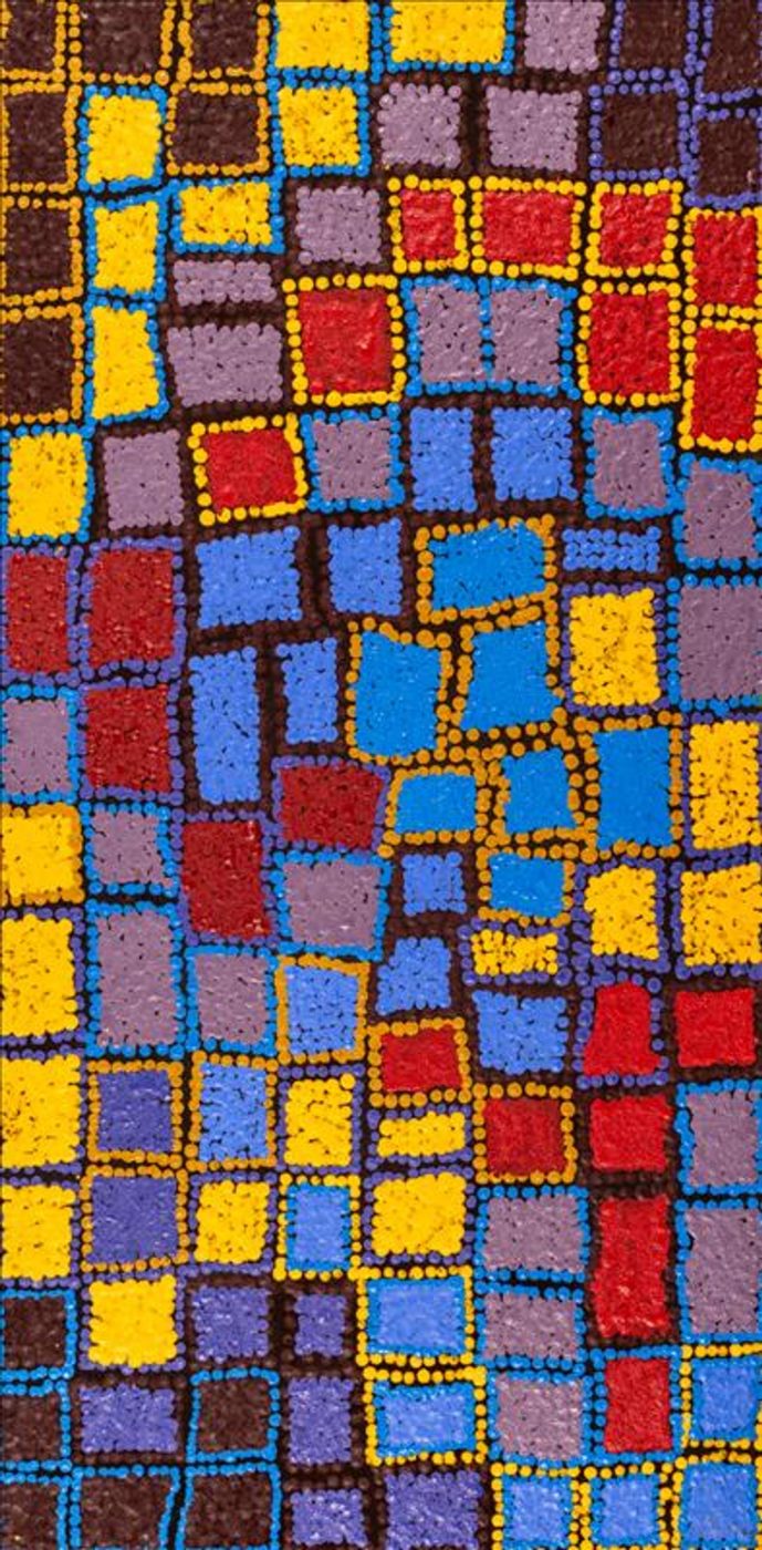 This painting depicts the Pamapardu Jukurrpa (Flying Ant Dreaming) from Warntungurru, west of Yuendumu. ‘Pamapardu’ is the Warlpiri name for the flying ants or termites that build the large anthills found throughout Warlpiri country. This country belongs to Nakamarra/Napurrurla women and Jakamarra/Jupurrurla men. ‘Pamapardu’ are flying ants. They build earth mounds (‘mingkirri’) that are common in the Tanami area. When heavy rains come in summer the ‘mingkirri’ get flooded out, so the ‘pamapardu’ grow wings and fly off to make new homes, following their queens to dry mounds or to build a new. When they have found their new home they drop their wings. In this stage they can be collected, lightly cooked in coals and eaten. As they fall to the ground women collect them to eat because they are nice and sweet. In contemporary Warlpiri paintings traditional iconography is used to represent the Jukurrpa, particular sites and other elements. When this Jukurrpa story is painted concentric circles are used to represent the ‘mingkirri’ and the rockholes involved in the story, including the central one at Wapurtali (Mt Singleton). Dashes are often depicted around the circles to represent the ‘pamapardu’.