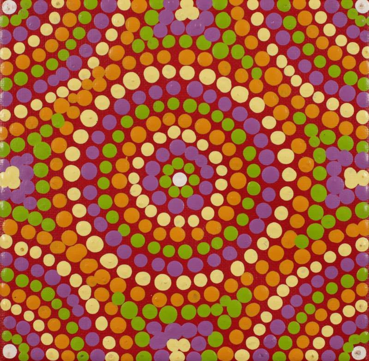 The artist has represented the patterns of the landscape associated to their country and to their Jukurrpa. Yuendumu is located 290 km north west of Alice Springs where sand storms and whirly-whirly (mini tornados) are a frequent occurrence in the country.