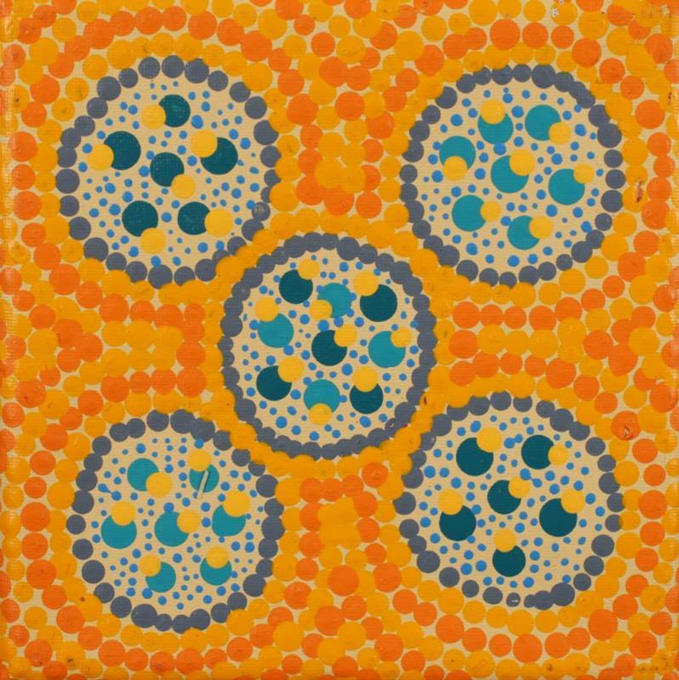The Wanakiji Jukurrpa (bush tomato [Solanum chippendalei] Dreaming) travels through Yaturlu (near Mount Theo, north of Yuendumu). “Wanakiji” grows in open spinifex country and is a small, prickly plant with purple flowers that bears green fleshy fruit with many small black seeds. After collecting the fruit the seeds are removed with a small wooden spoon called ‘kajalarra’. The fruit then can be eaten raw or threaded onto skewers called ‘turlturrpa’ and then cooked over a fire. ‘Wanakiji’ can also be skewered and left to dry. When they are prepared in this way it is called ‘turlturrpa’ and the fruit can be kept for a long time. In contemporary Warlpiri paintings traditional iconography is used to represent the Jukurrpa, particular sites and other elements. The Wanakiji Jukurrpa belongs to Napanangka/Napangardi women and Japanangka/Japangardi men.
