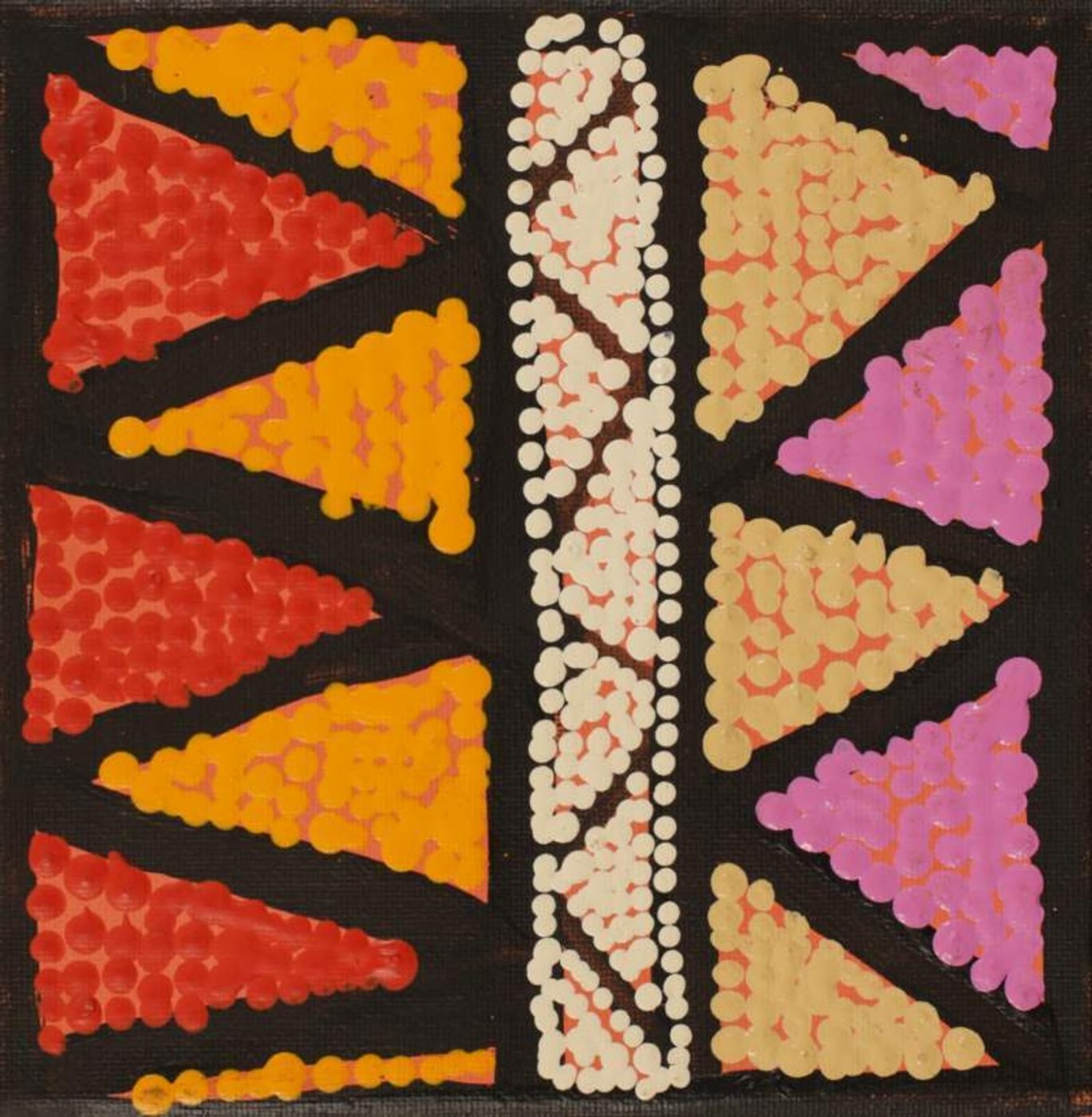 The custodians of the Yawakiyi Jukurrpa (native currant Dreaming [Canthium latifolium]) are Napurrurla/Nakamarra women and Jupurrurla/ Jakamarra men. The ‘yawakiji’ tree is large and it bears small, black currant-like fruits. Traditionally the fruit would be gathered by women and placed in wooden food carriers. They are mixed with water before been eaten, although the ‘yawakiyi’ are sweet and can be also eaten straight off the tree. Shown in this painting are the Nakamarra and Napurrurla women collecting ‘yawakiyi’ at a place called Mititinyanyanu to the north-west of Yuendumu. The white flowers come out first then the ‘yawakiyi’ fruit grows after heavy rain. Magpie bird also eats the ‘yawakiyi’. In contemporary Warlpiri paintings traditional iconography is used to represent the Jukurrpa, associated sites and other elements. In paintings of this Jukurrpa the branches of ‘yawakiyi’ are shown spread out across the country. The ‘U’ shapes represent women, while the oval shapes beside them usually depict ‘parrajas’, which are the food carriers used to collect the fruit.