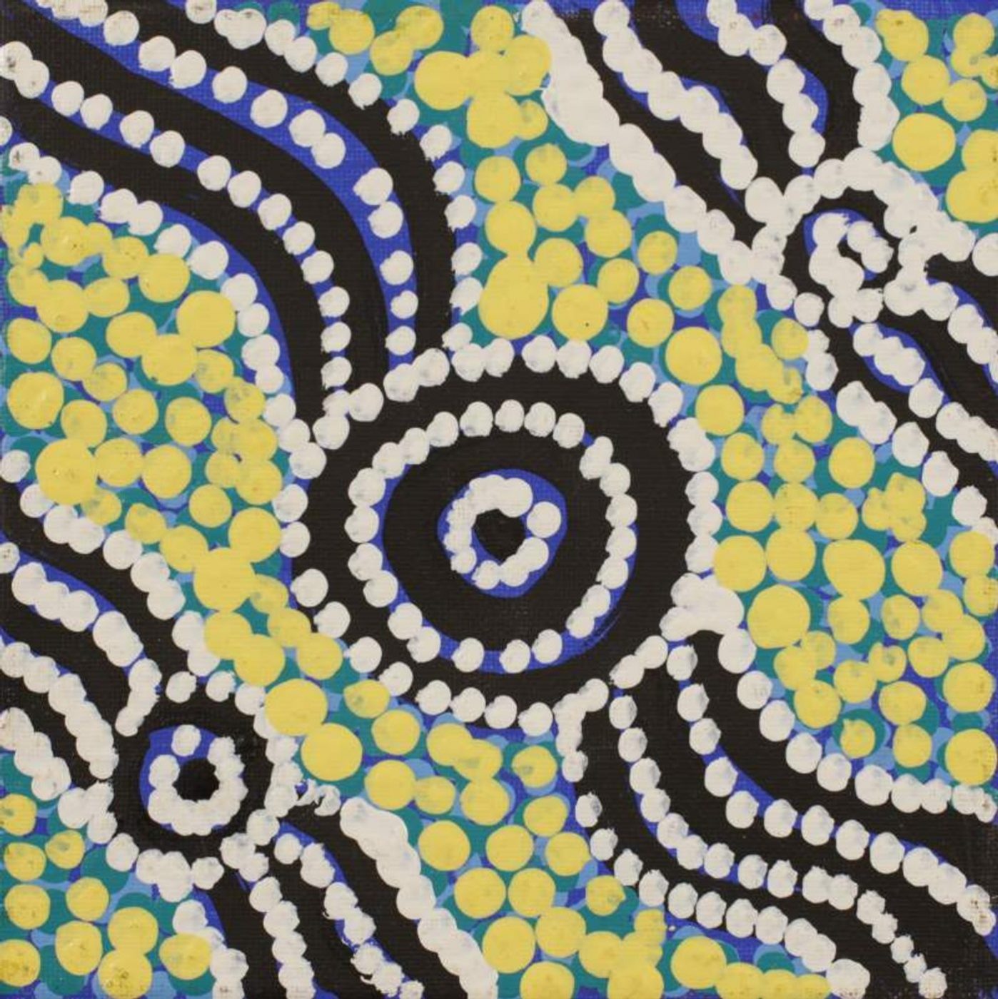 The ‘ngalyipi Jukurrpa’ (snakevine [Tinospora smilacina] Dreaming) depicted in this painting comes from Purturlu (Mount Theo), located approximately 150kms north-northwest of Yuendumu. The ‘kirda’ (owners) of this Dreaming are Napanangka/Napangardi women and Japanangka/Japangardi men. The ‘kurdungurlu’ (custodians) for this Dreaming are Nangala/Nakamarra women and Jangala/Jakamarra men. A number of other Dreamings are also located in, or pass through, Purturlu; these include ‘wakurlpirri Jukurrpa’ (Dogwood tree Dreaming), ‘wardapi Jukurrpa’ (goanna Jukurrpa), and ‘kanta Jukurrpa’ (bush coconut Dreaming).