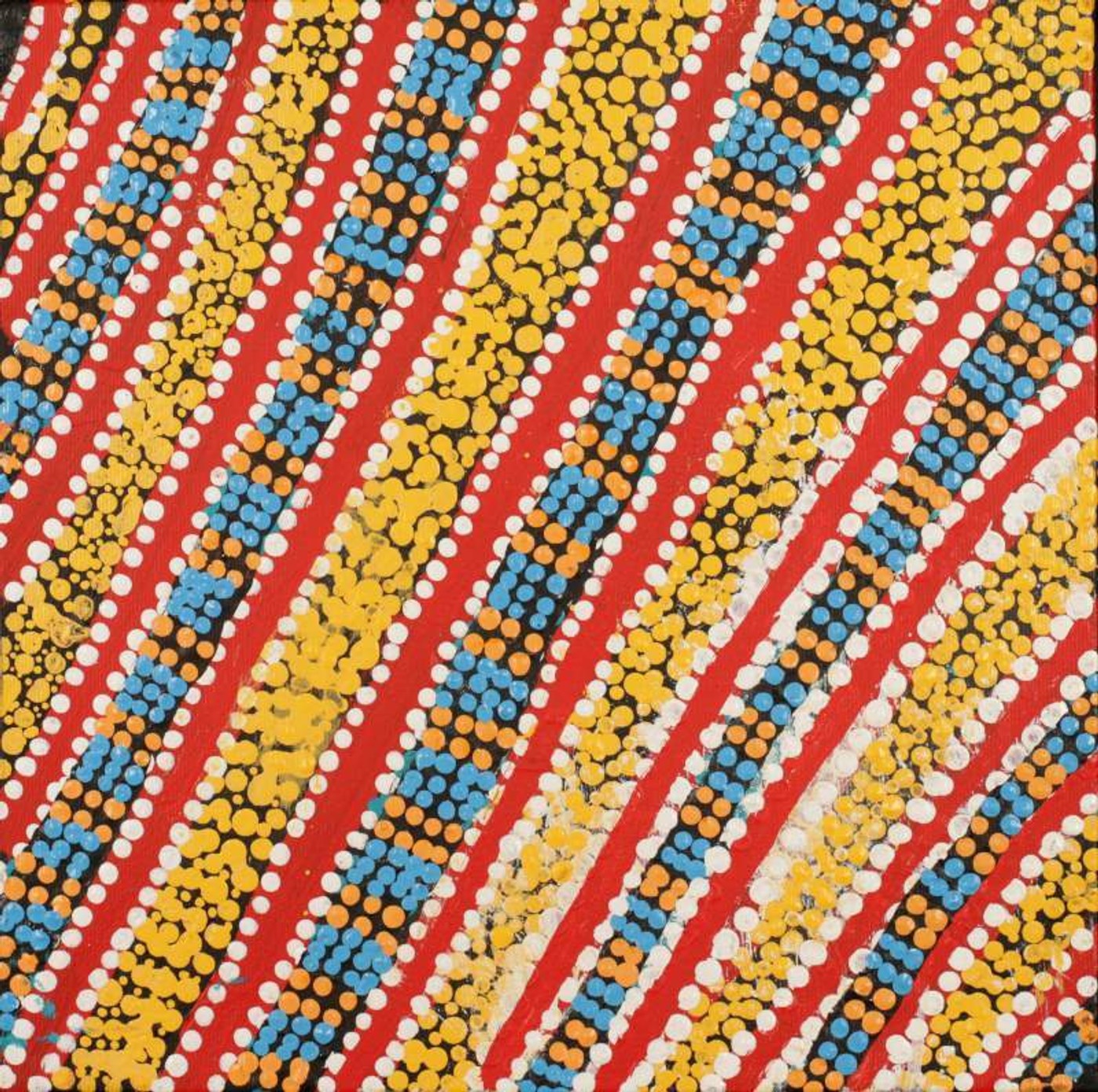 The ‘kirda’ (owners) of this Jukurrpa are Napangardi/Napanangka women and Japangardi/Japanangka men. There are a number of different Jukurrpa associated with Mina Mina; artists usually choose to depict one particular Jukurrpa in their paintings. In addition to ‘jintiparnta’ (desert truffle), these can include ‘karnta’ (women), ‘karlangu’ (digging sticks), ‘majardi’ (hairstring skirts/tassels), ‘ngalyipi’ (snakevine [Tinospora smilacina]), and ‘kurrkara’ (desert oak [Allocasuarina decaisneana]).