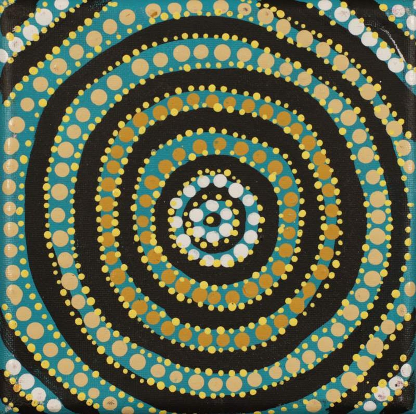 The place depicted in this painting, Ngama, is located south of Yuendumu in the Northern Territory. This Dreaming belongs to Nakamarra/Napurrurla women and Jakamarra/Jupurrurla men. This story describes the journey of Yarripiri, an ancestral ‘warna’ (snake). He travelled from Wirnparrku near Mt. Liebig to Yimparlu, and continued its way through the territories of Ngapanangka-jarra, Warlajirryi, Kurnmundu, Yinyirrinyi on to Ngama. Later Yarripiri travelled further north via Mijirlparnta (Mission Creek) and right through to the top end of Australia.Yarripiri was very sad as his family had left him behind at Wirnparrku. He was blind and crippled but he was determined to follow and search them out. He had to be carried. This was the job undertaken by the ‘kurdungurlu’ (ceremonial police) of the Dreaming: the Nangala/Nampijinpa women and Jangala/Jampijinpa men. Where Yarripiri’s tail slumped and touched the ground creeks were formed, such as Mijirlparnta, west of Yuendumu. Yarripiri tracks and paths are often represented by arc shapes or curved lines depicted across the canvas.